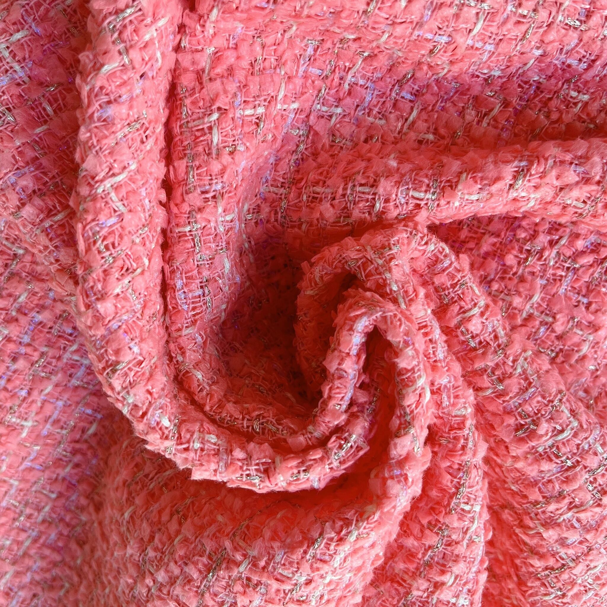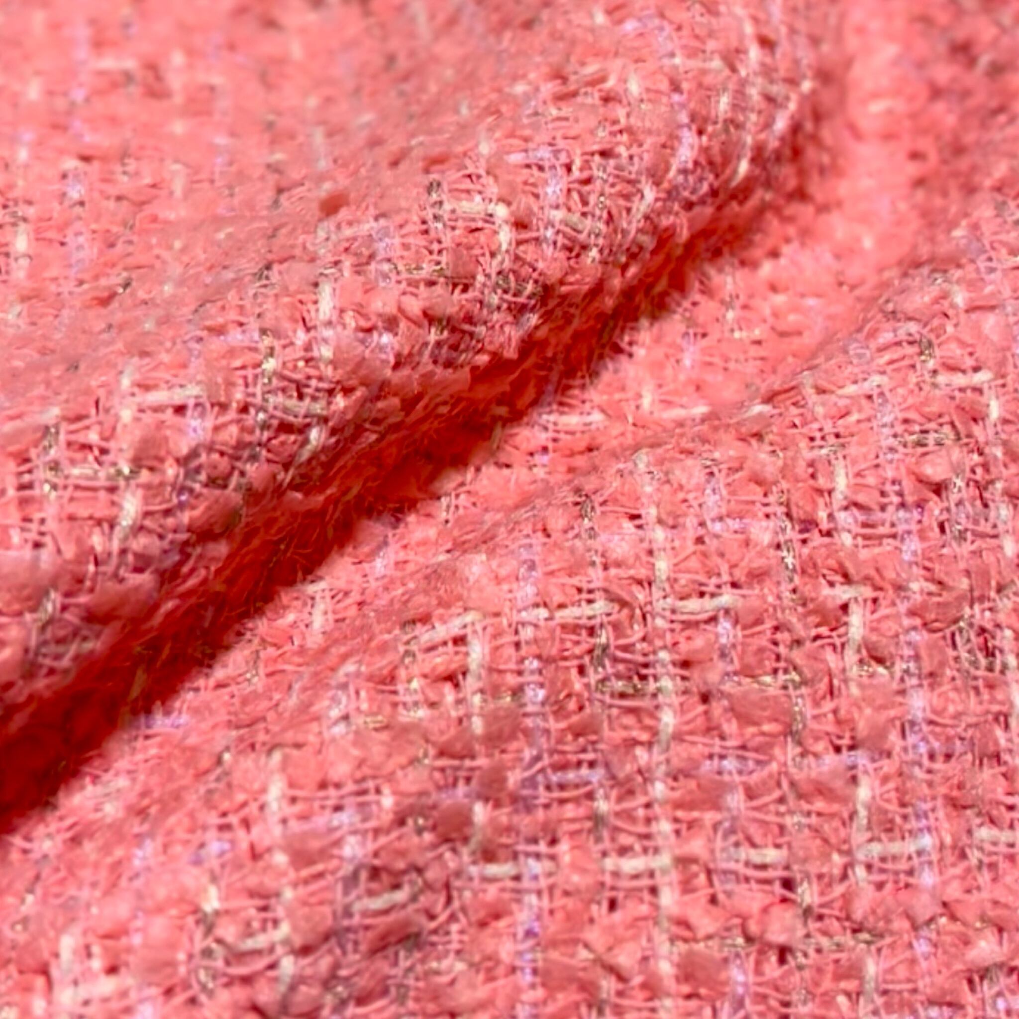 海外から買い付けたファンシーツイードの生地です。細かくラメが入っていて、見る角度や光の当たり具合によって微妙に色合いが変化します。色味や素材の違う糸で編み込まれた繊細な布の表情と細やかな風合いをお楽しみください。お洋服やバッグ、小物など様々なアイテムにご使用頂けます。