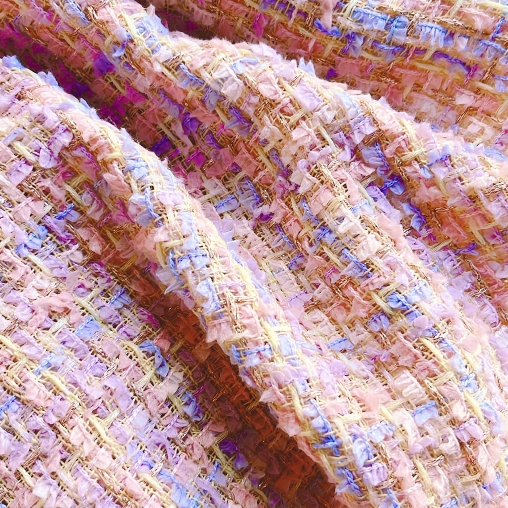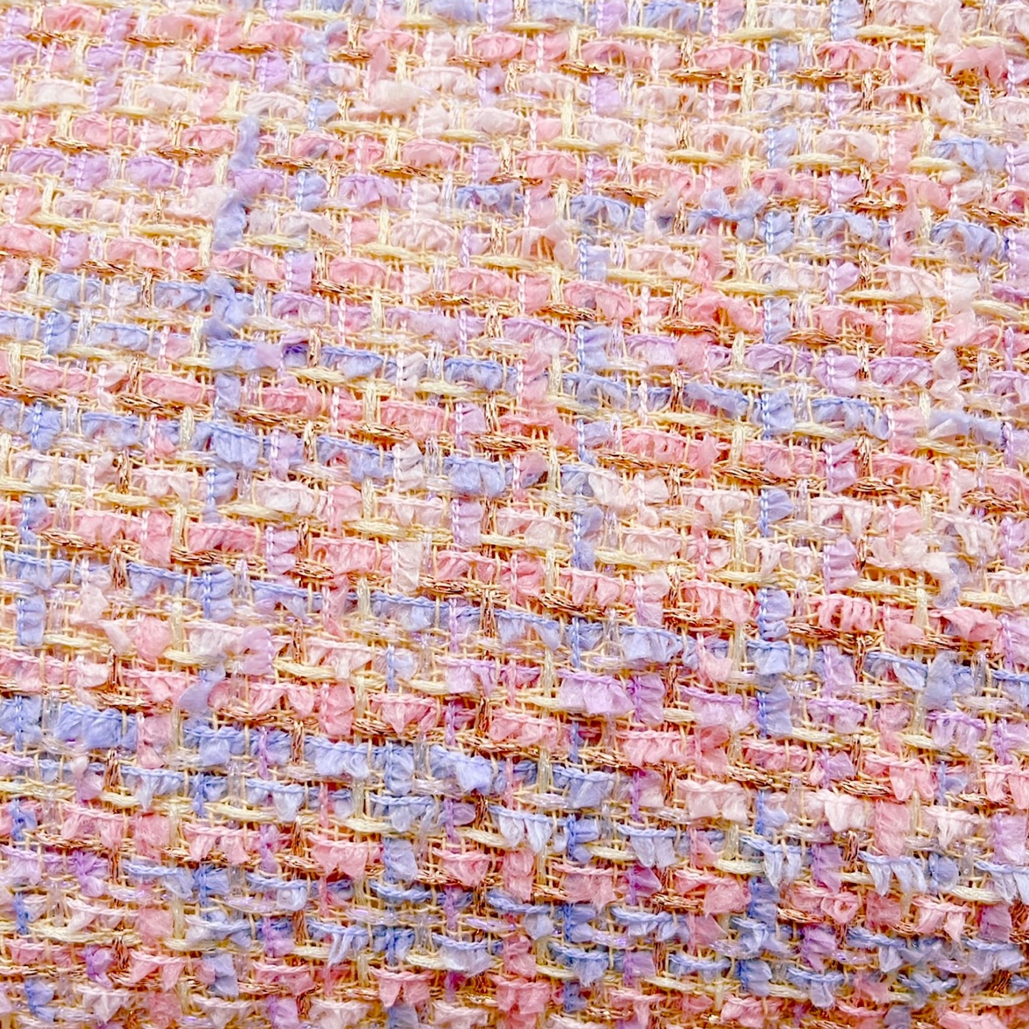 海外から買い付けたファンシーツイードの生地です。細かくラメが入っていて、見る角度や光の当たり具合によって微妙に色合いが変化します。色味や素材の違う糸で編み込まれた繊細な布の表情と細やかな風合いをお楽しみください。お洋服やバッグ、小物など様々なアイテムにご使用頂けます。