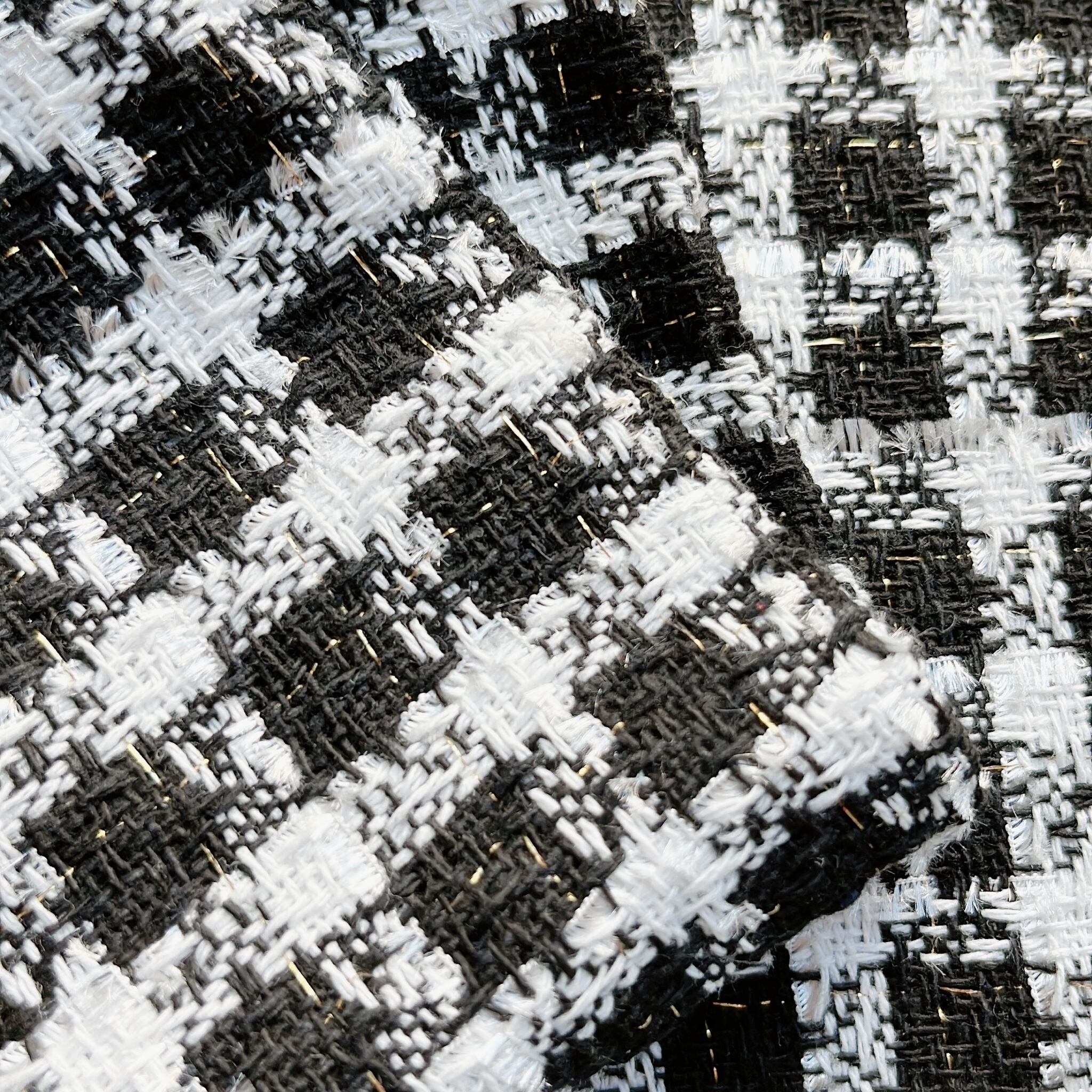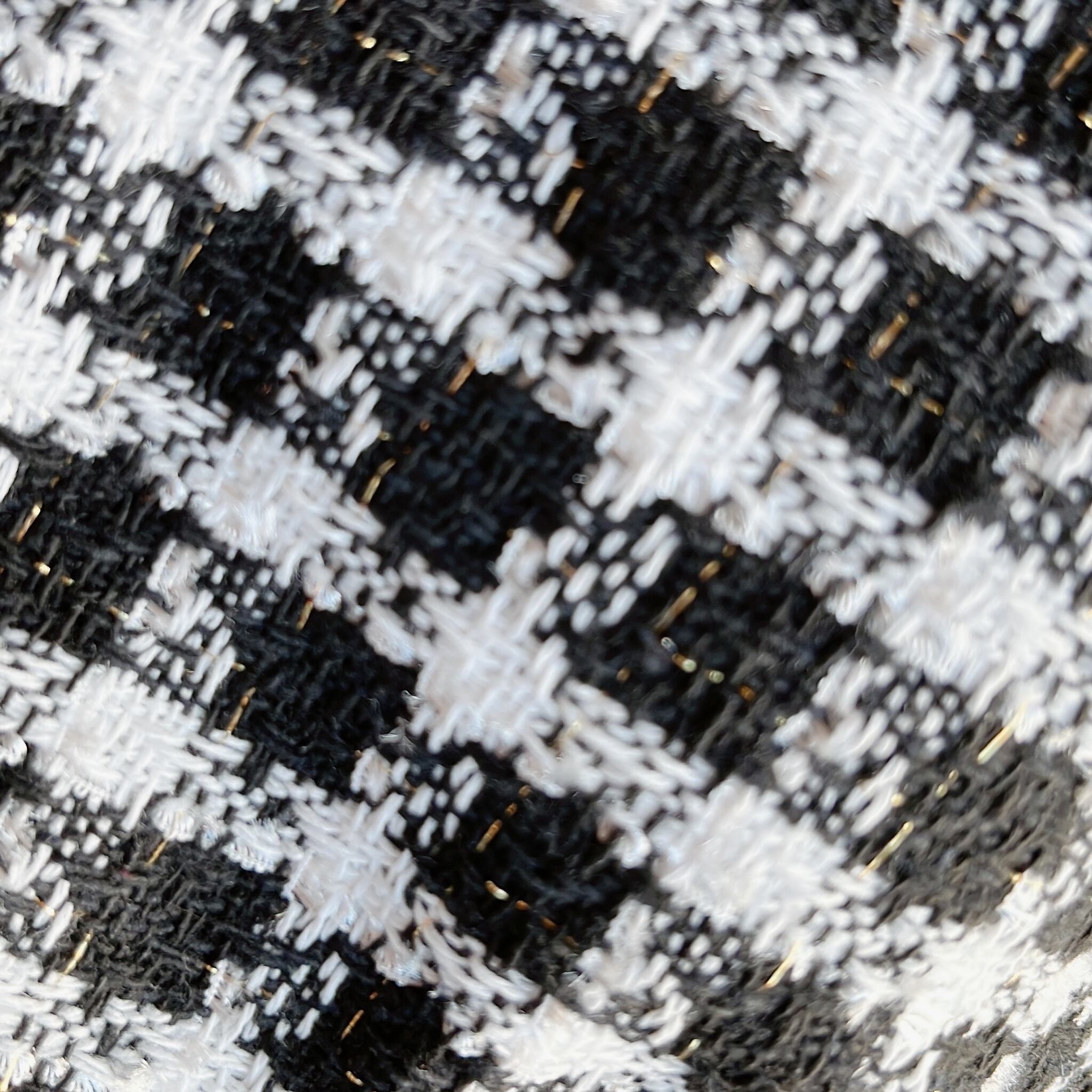 海外から買い付けたファンシーツイードの生地です。大きめのブロックチェック柄がキュートでフワフワとした優しい素材感が特徴的な生地です。しなやかさも兼ね備えており、幅広い用途にお使い頂けます。また、うっすらと細いゴールドラメの糸が織り込まれているので、見る角度や光の当たり具合によってキラキラと輝きます。微妙な太さや素材の違う糸で編み込まれた繊細な布の表情と細やかな風合いをお楽しみください。柔らかく軽めの生地なので、ツイード生地の中でも手触りが良く、お洋服やバッグ、小物など様々なアイテムにご使用頂けます。