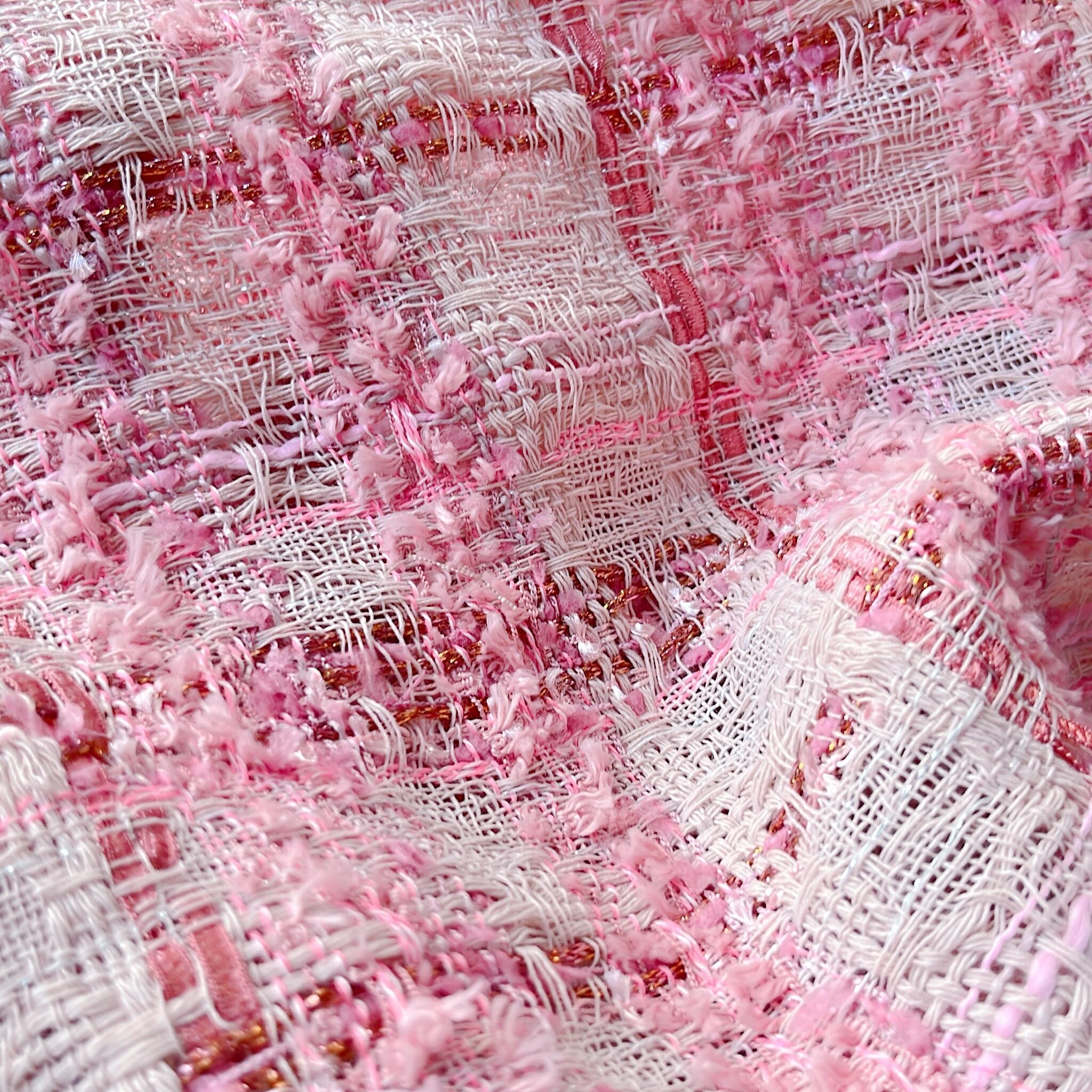 海外から買い付けたツイードの生地です。太さや質感の違う糸やラメの入った糸が織り込まれて柄を構成している為、見る角度や光の当たり具合によって微妙な変化を楽しめるファブリックです。上品な糸によって構成された華やかな生地の柄をお楽しみください。ツイード生地の中では比較的大きな柄の生地なので、お洋服やバッグなど、面を広く取るアイテム作成にオススメです。