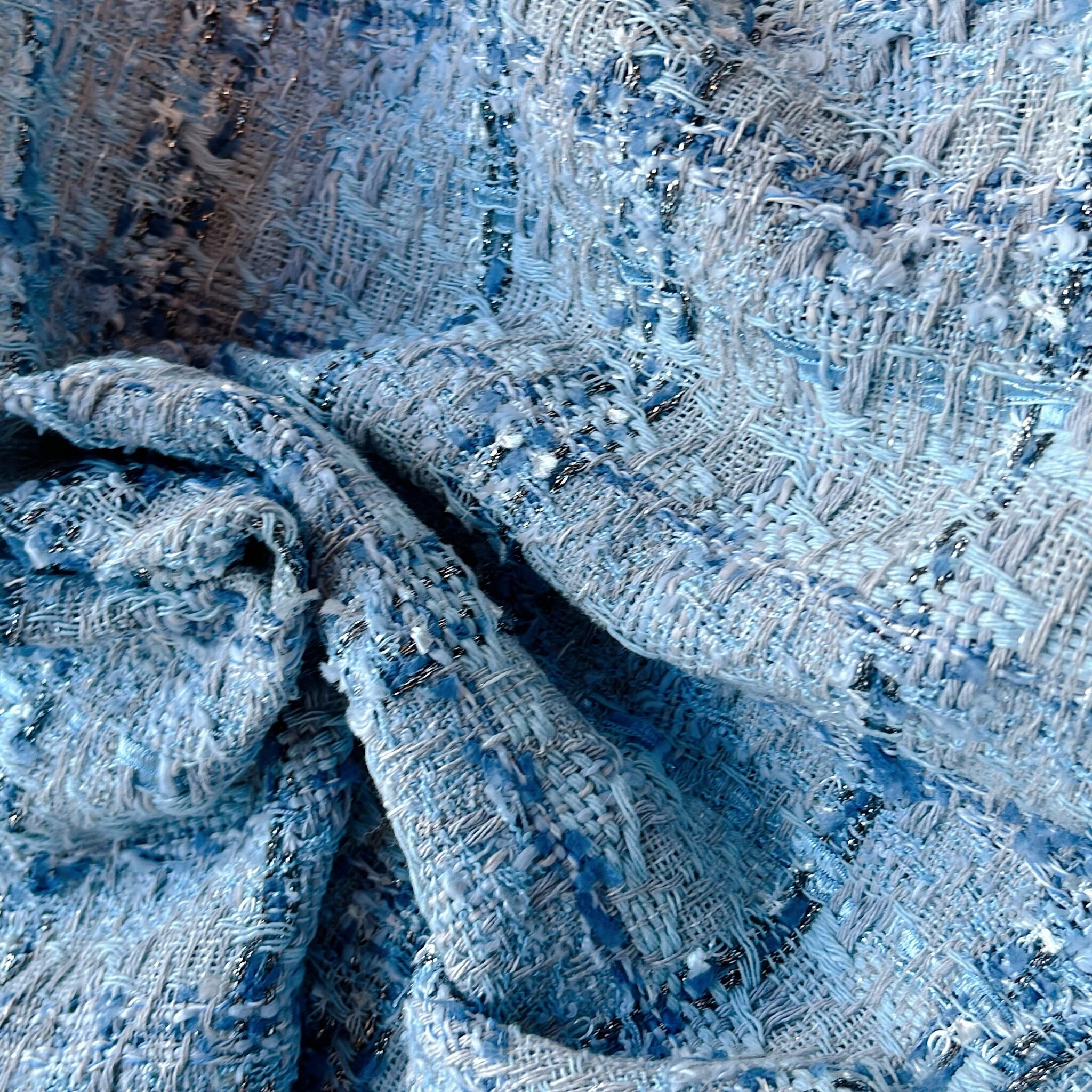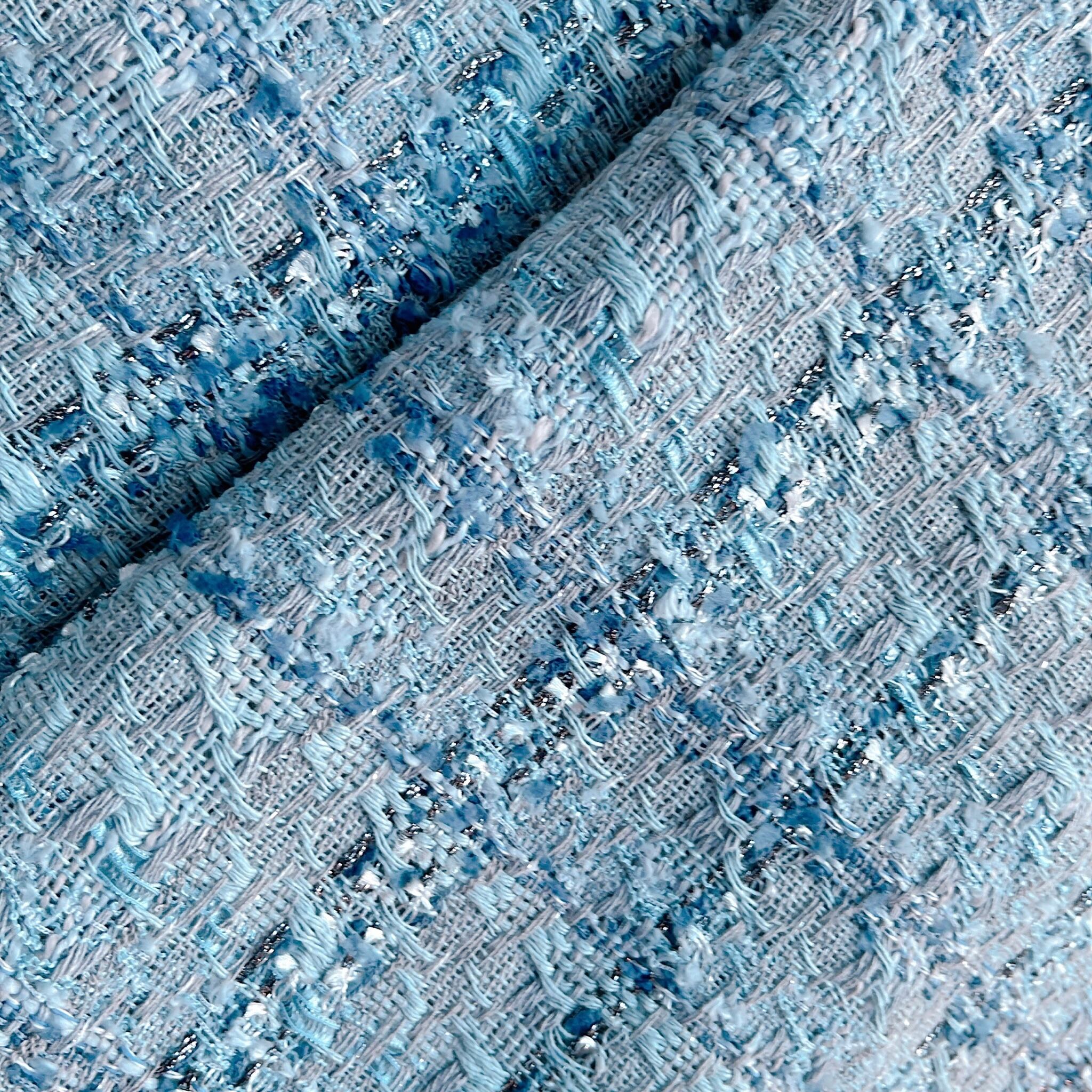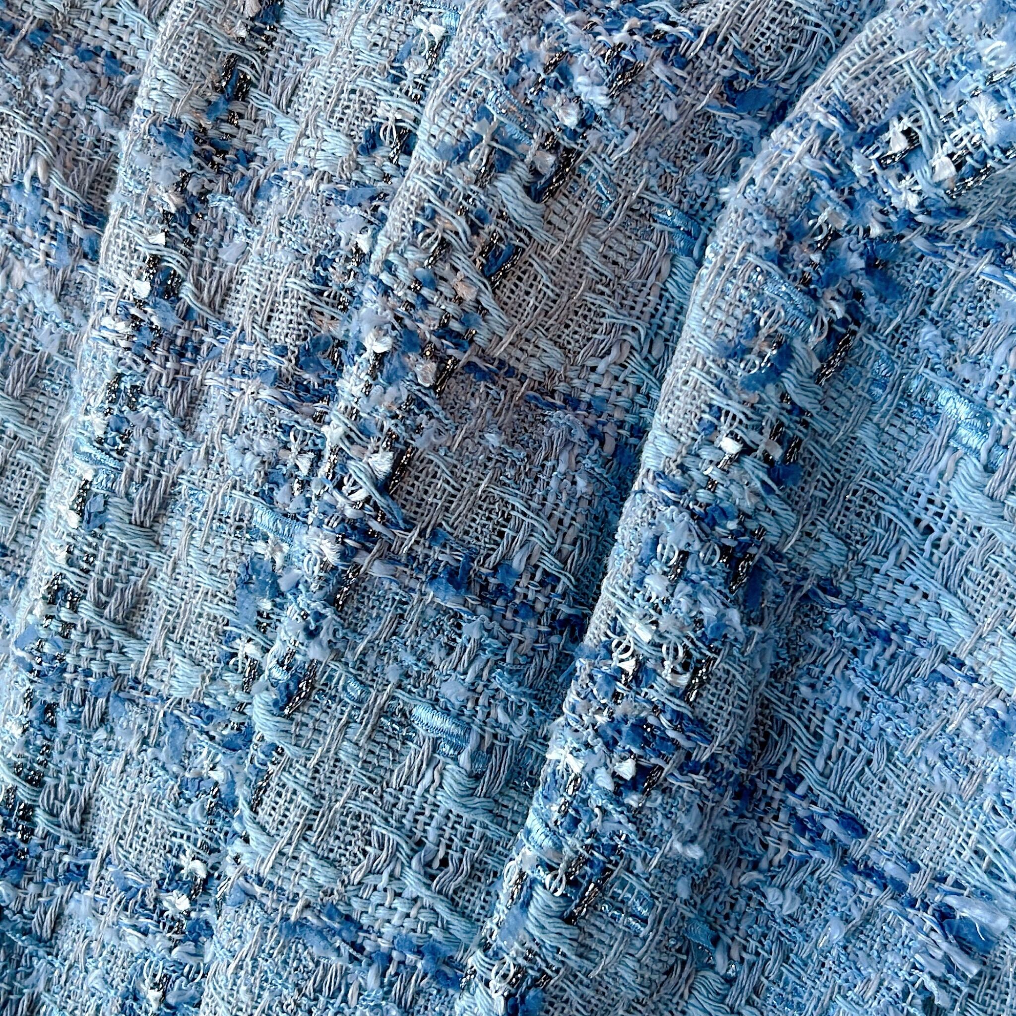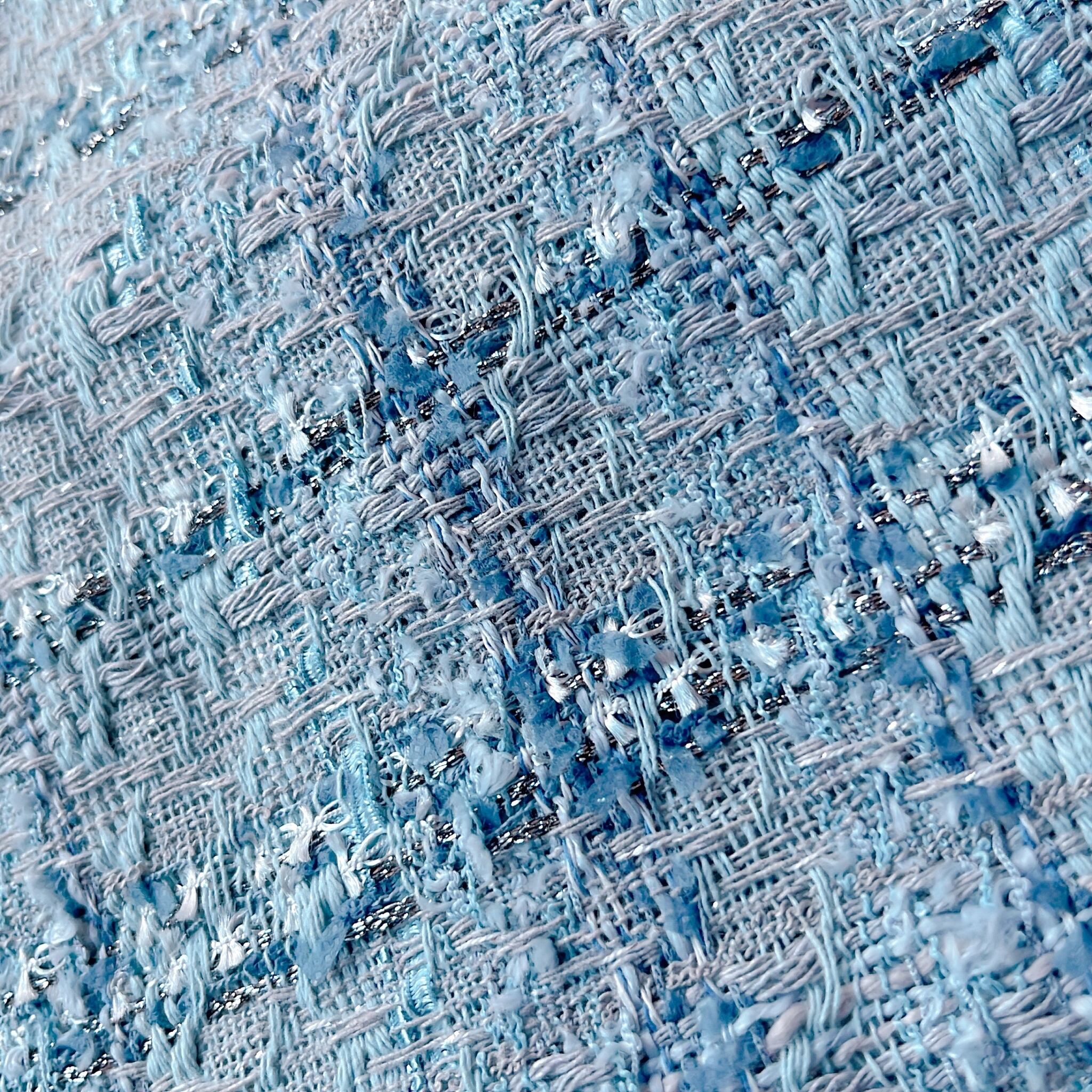 海外から買い付けたツイードの生地です。太さや質感の違う糸やラメの入った糸が織り込まれて柄を構成している為、見る角度や光の当たり具合によって微妙な変化を楽しめるファブリックです。上品な糸によって構成された華やかな生地の柄をお楽しみください。ツイード生地の中では比較的大きな柄の生地なので、お洋服やバッグなど、面を広く取るアイテム作成にオススメです。