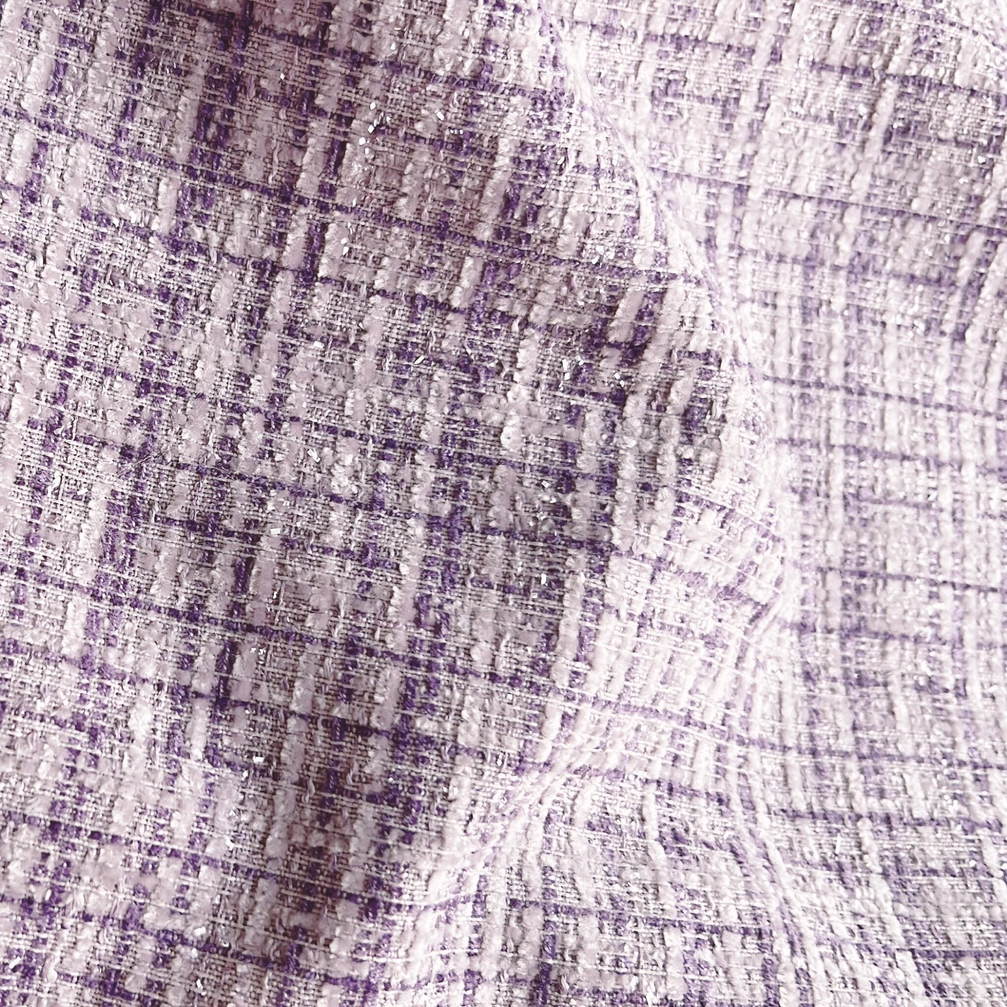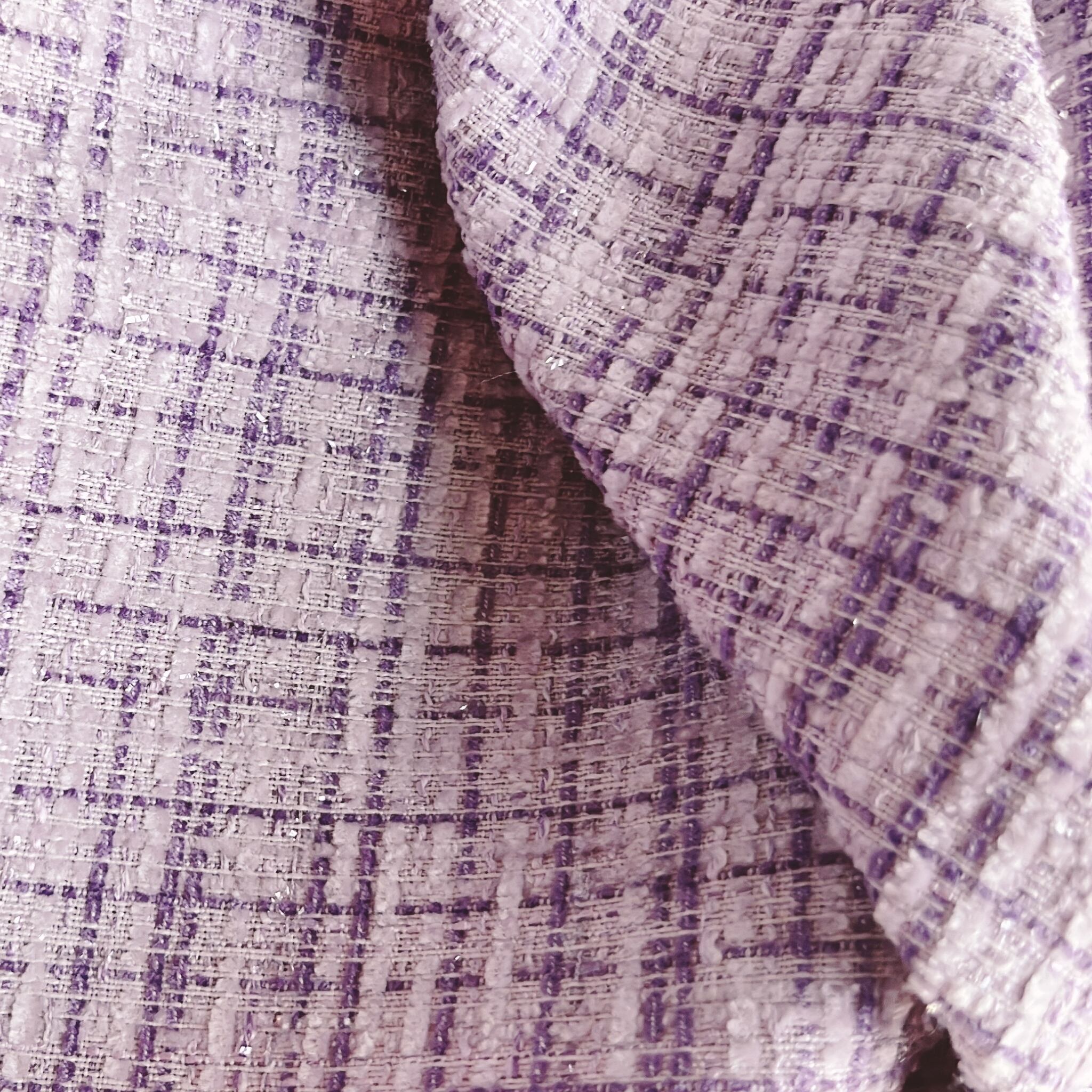 海外から買い付けたツイードの生地です。太さや質感の違う糸やラメの入った糸が織り込まれて構成されたファンシーツイード生地で、見る角度や光の当たり具合によって微妙な変化を楽しめるファブリックです。ガーリーな色合いと柄で構成された可愛らしい生地をお楽しみください。ツイード生地の中では比較的しっかりと織り込まれた生地なので、引っ掛かりやほつれの心配が少なく、デイリー使いするアイテムへの利用にもオススメです。