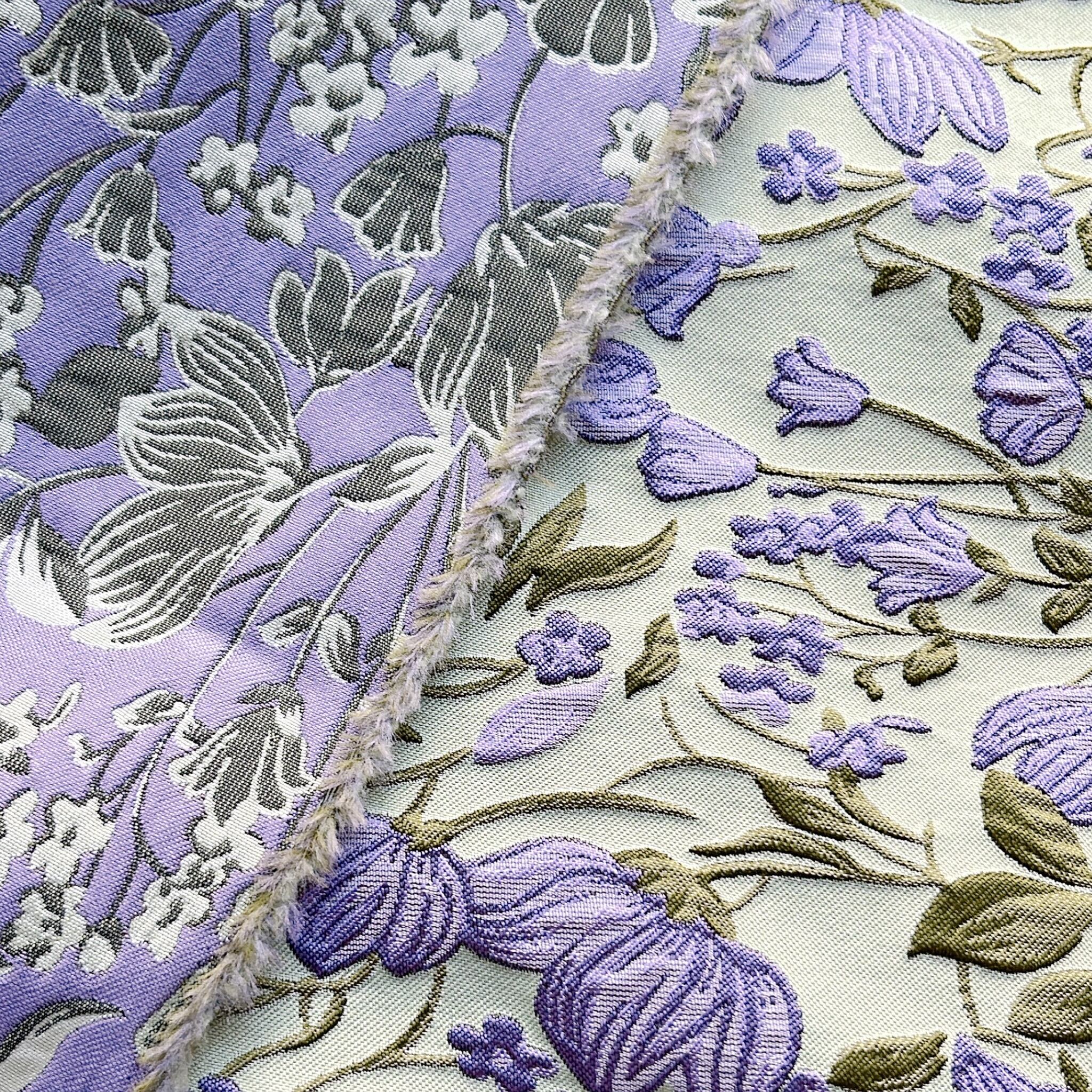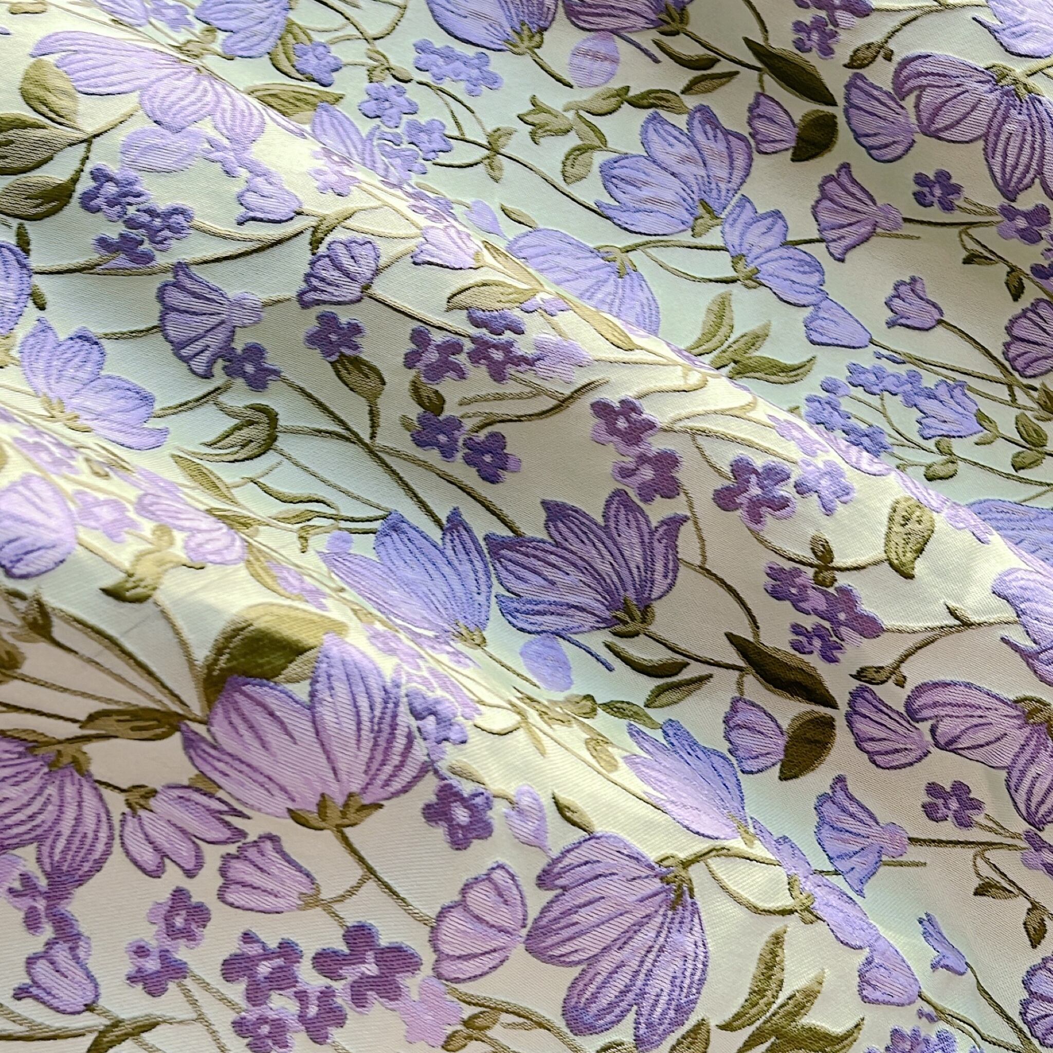 海外から買い付けたファンシージャガード生地です。生地全体に花柄をあしらった華やかな生地です。日本ではあまり見かけない独特な柄物の生地なので、1枚でスカートなどのファッションアイテムを仕立てるのにもオススメです。