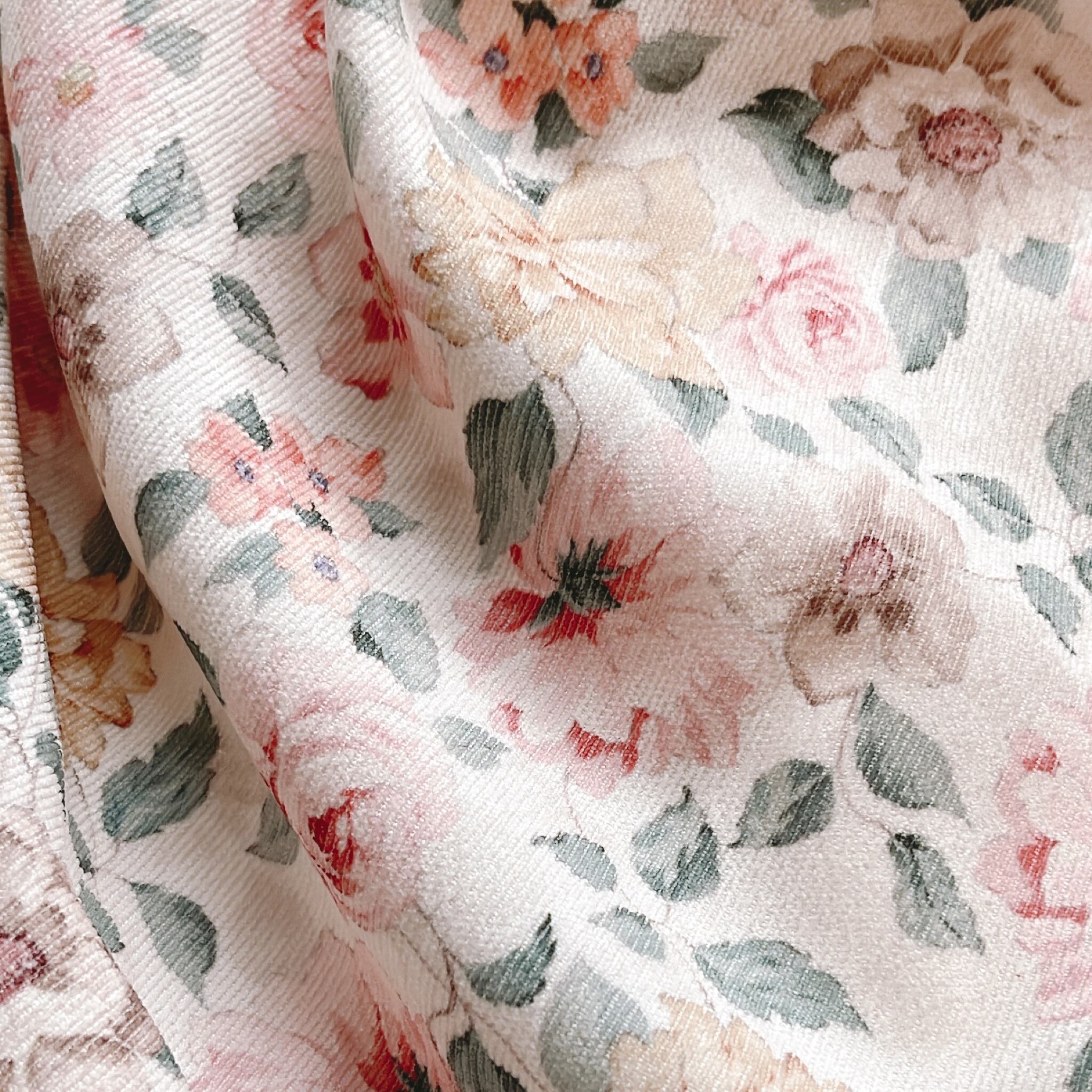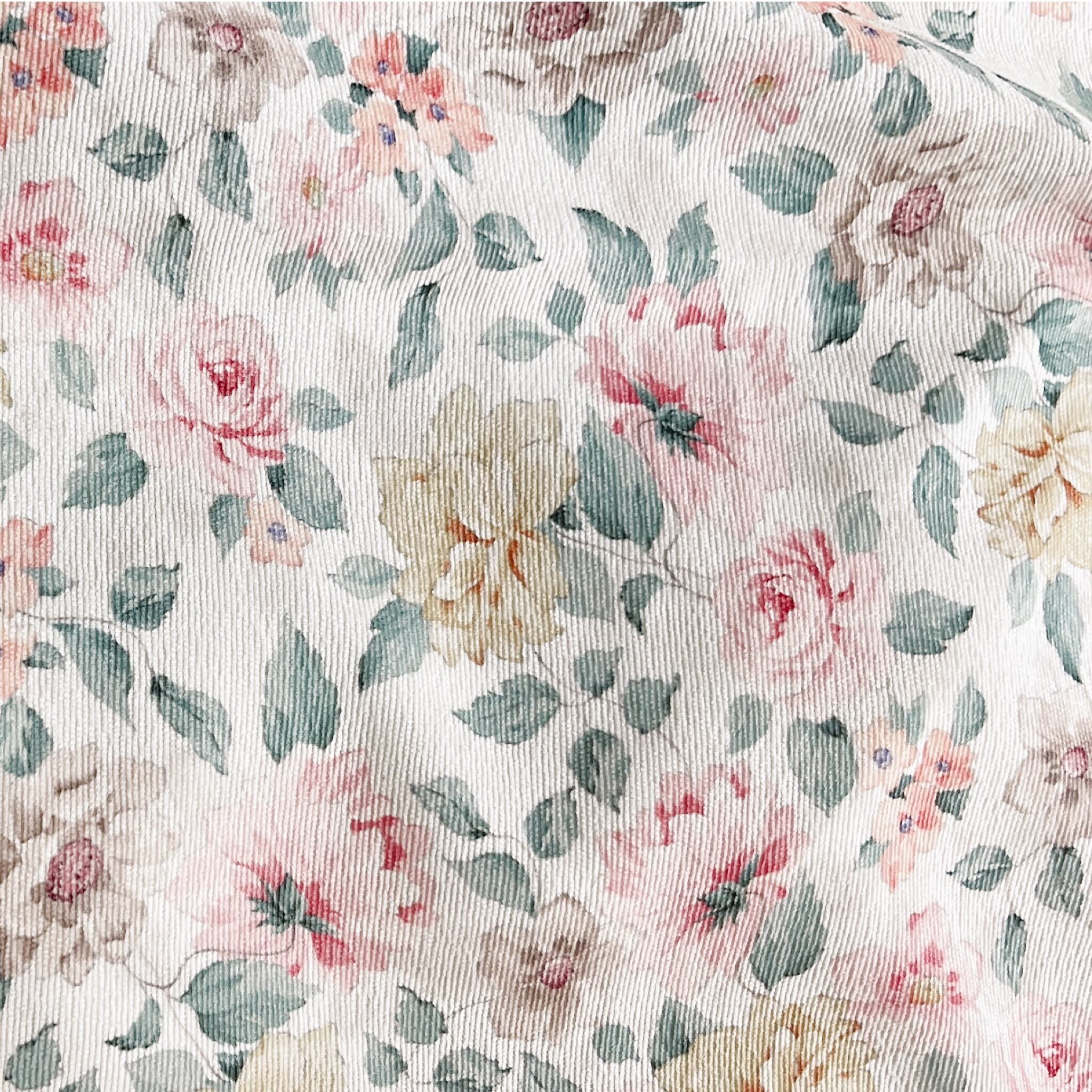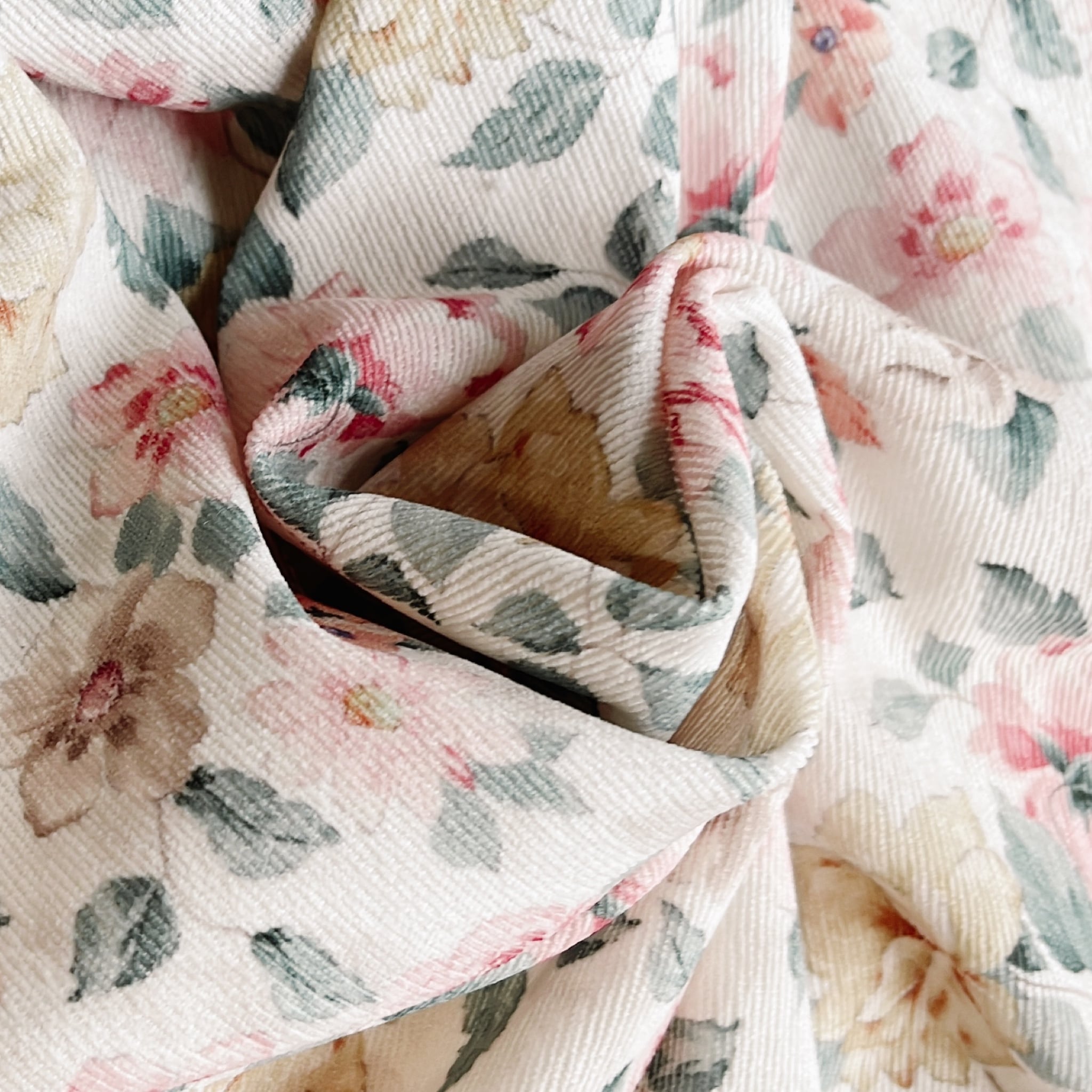海外から買い付けたコーデュロイのプリント生地です。華やかな花柄のプリントが可愛らしく、春にピッタリなパステルカラーを4色ご用意しました。薄手のコーデュロイ生地なので、これからの季節に着るワンピースやブラウスのお仕立てにもオススメです。上品なお花柄とコーデュロイの質感をお楽しみください。