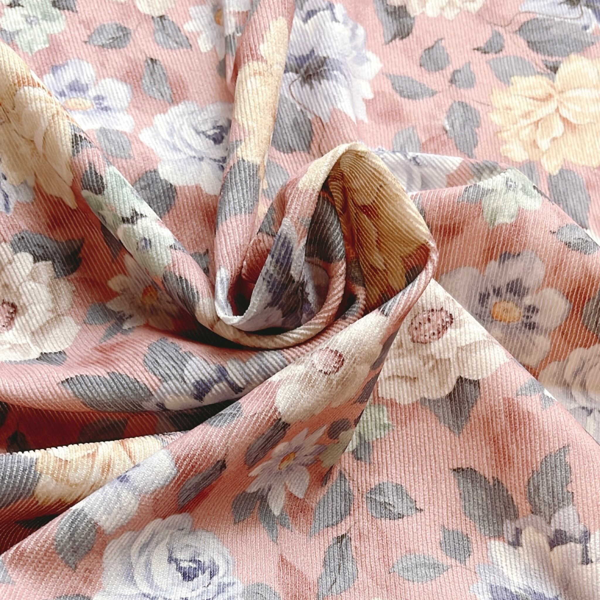 海外から買い付けたコーデュロイのプリント生地です。華やかな花柄のプリントが可愛らしく、春にピッタリなパステルカラーを4色ご用意しました。薄手のコーデュロイ生地なので、これからの季節に着るワンピースやブラウスのお仕立てにもオススメです。上品なお花柄とコーデュロイの質感をお楽しみください。