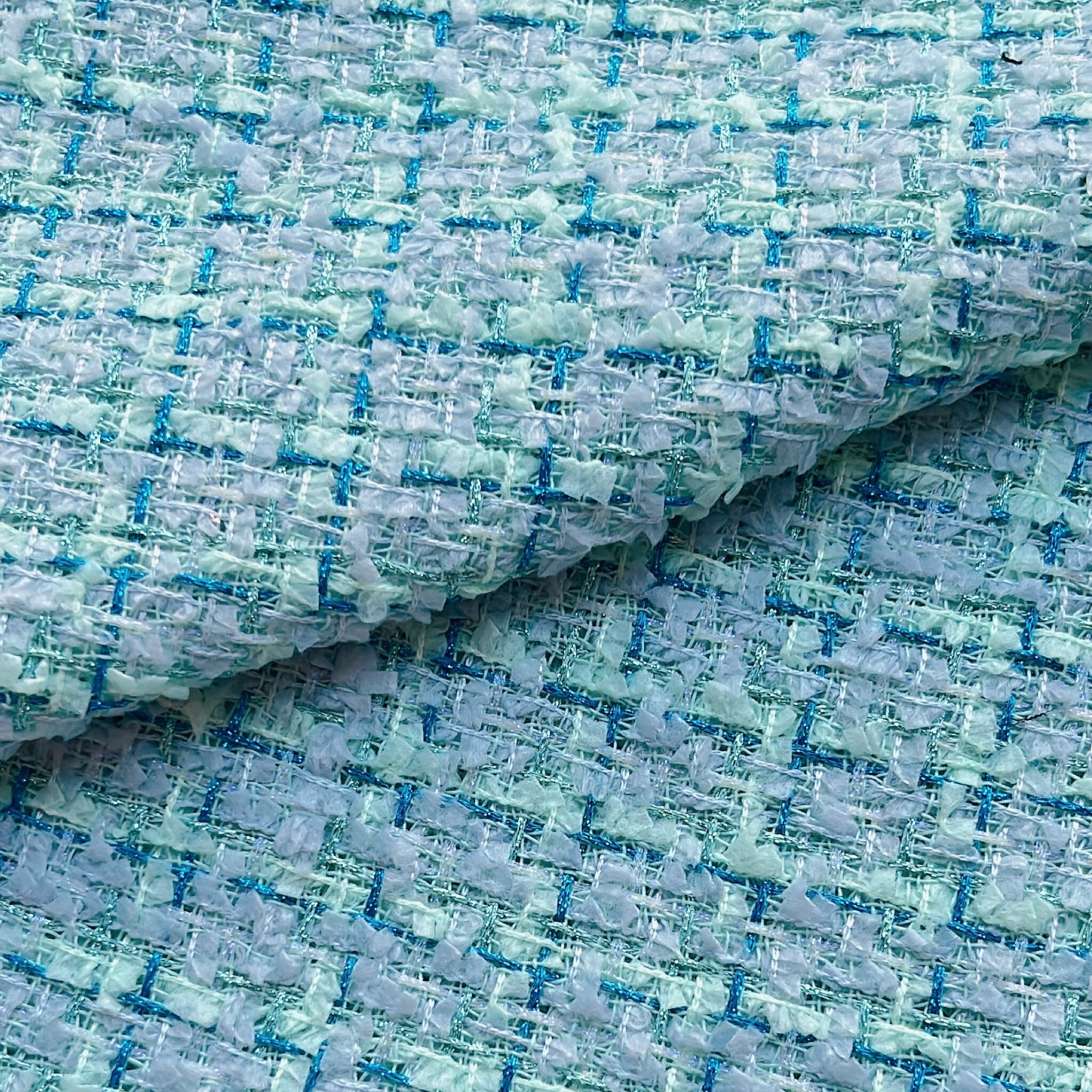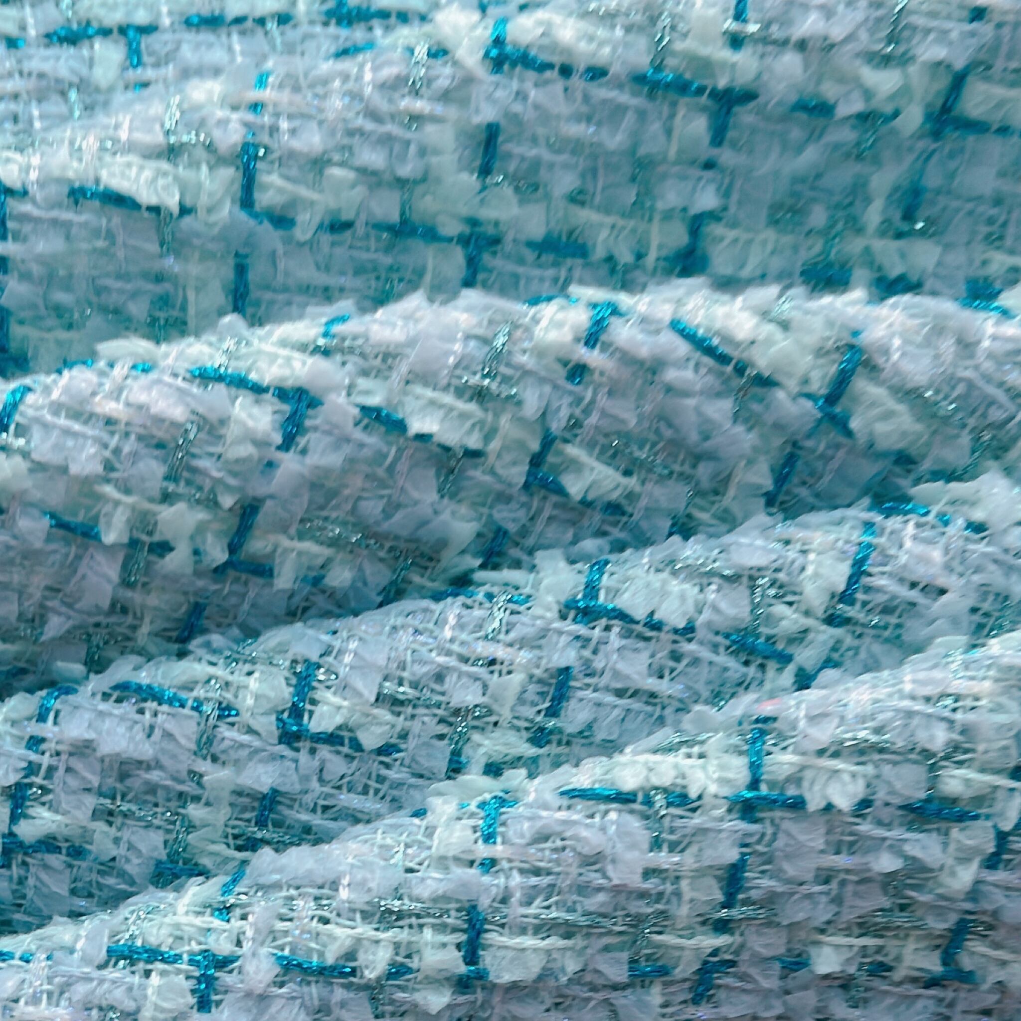 海外から買い付けたファンシーツイードの生地です。細かくラメが入っていて、見る角度や光の当たり具合によって微妙に色合いが変化します。色味や素材の違う糸で編み込まれた繊細な布の表情と細やかな風合いをお楽しみください。お洋服やバッグ、小物など様々なアイテムにご使用頂けます。