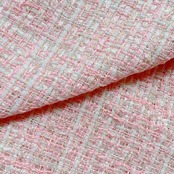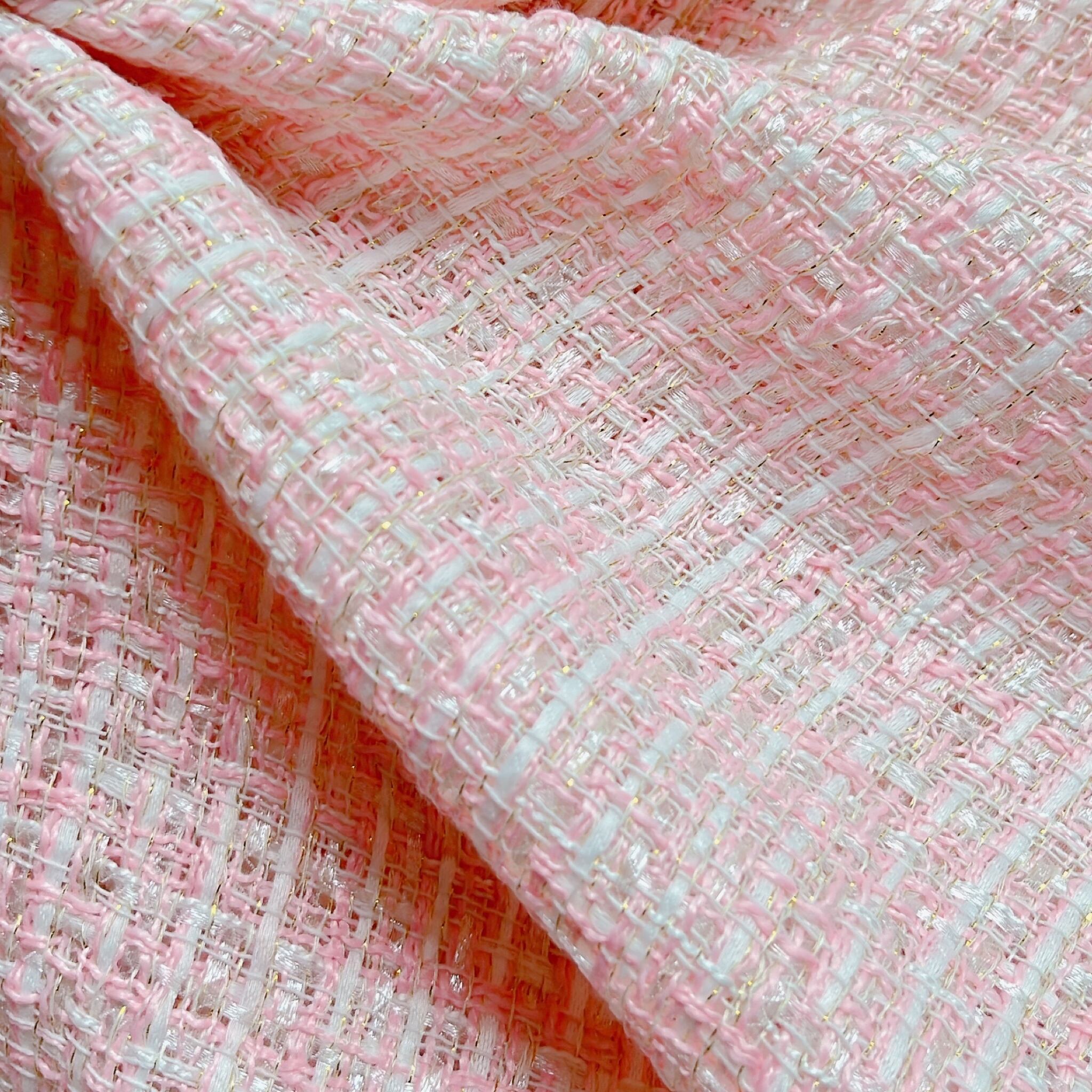 海外から買い付けたファンシーツイードの生地です。パステルカラーの優しいお色が特徴の生地で、夏らしい太めのホワイトヤーンが織り込まれた爽やかなファブリックです。また、細い金糸が織り込まれている為、キラキラと輝き、見る角度や光の当たり具合によってキラキラと輝きます。生地自体に透け感は無くしっかりとした生地ですが、通気性のある生地で、夏のお仕立てにもピッタリの生地です。バッグやジャケットなどのお仕立てにもオススメです。明るく夏らしいヤーンで織り込まれた爽やかなツイードテキストをお楽しみください。