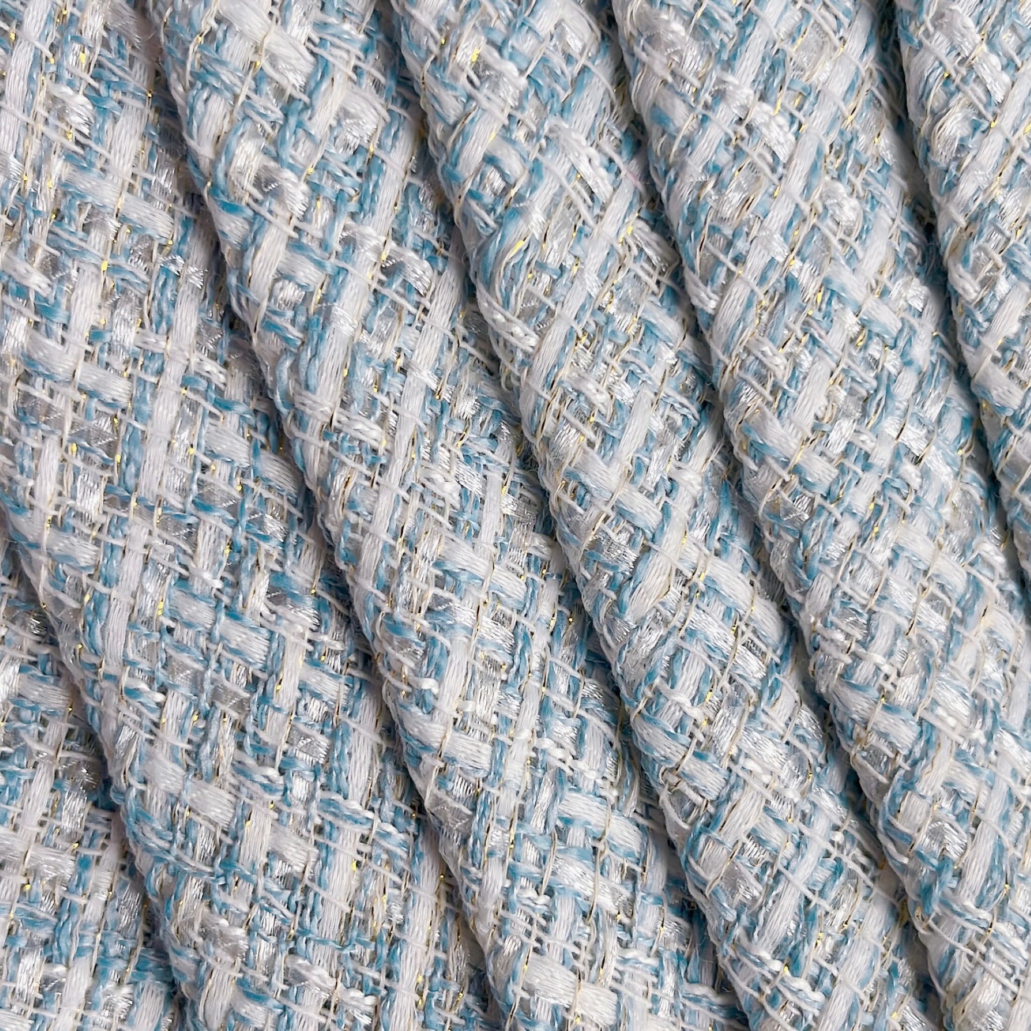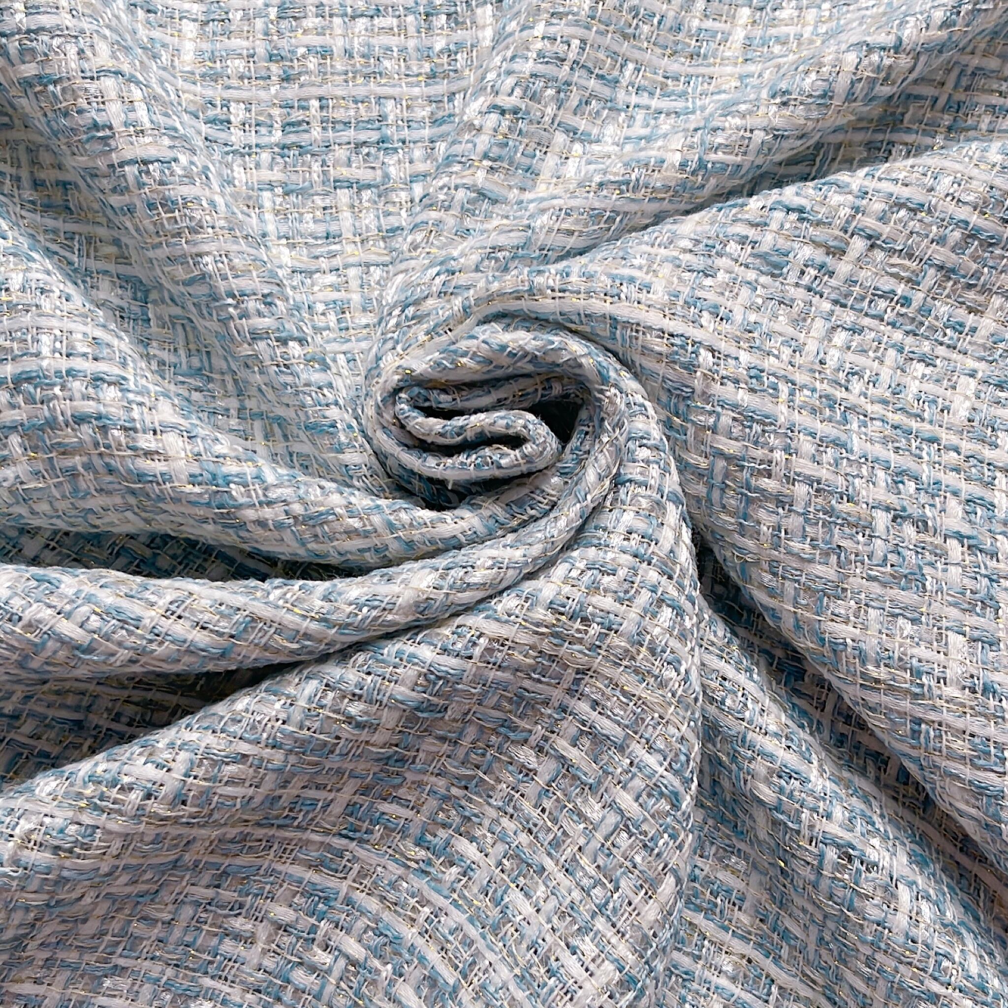 海外から買い付けたファンシーツイードの生地です。パステルカラーの優しいお色が特徴の生地で、夏らしい太めのホワイトヤーンが織り込まれた爽やかなファブリックです。また、細い金糸が織り込まれている為、キラキラと輝き、見る角度や光の当たり具合によってキラキラと輝きます。生地自体に透け感は無くしっかりとした生地ですが、通気性のある生地で、夏のお仕立てにもピッタリの生地です。バッグやジャケットなどのお仕立てにもオススメです。明るく夏らしいヤーンで織り込まれた爽やかなツイードテキストをお楽しみください。