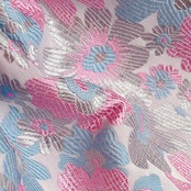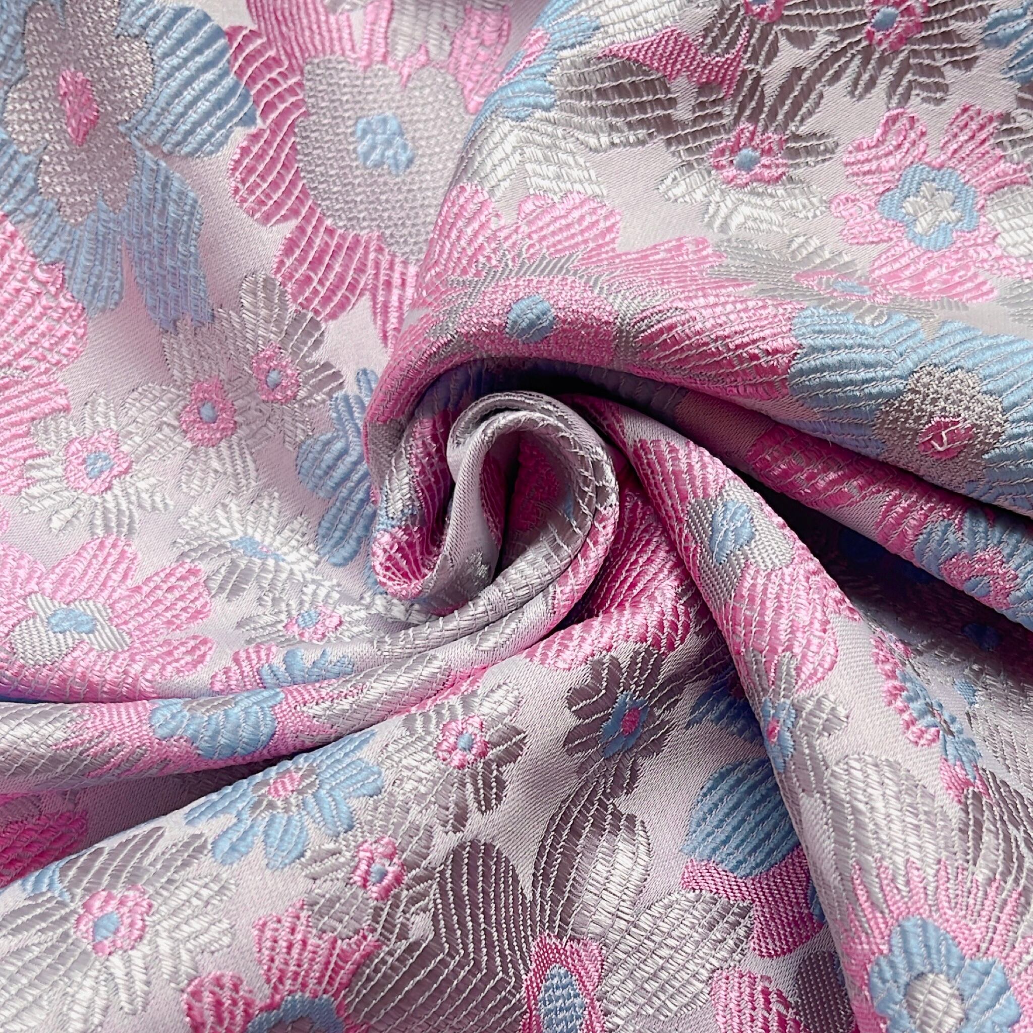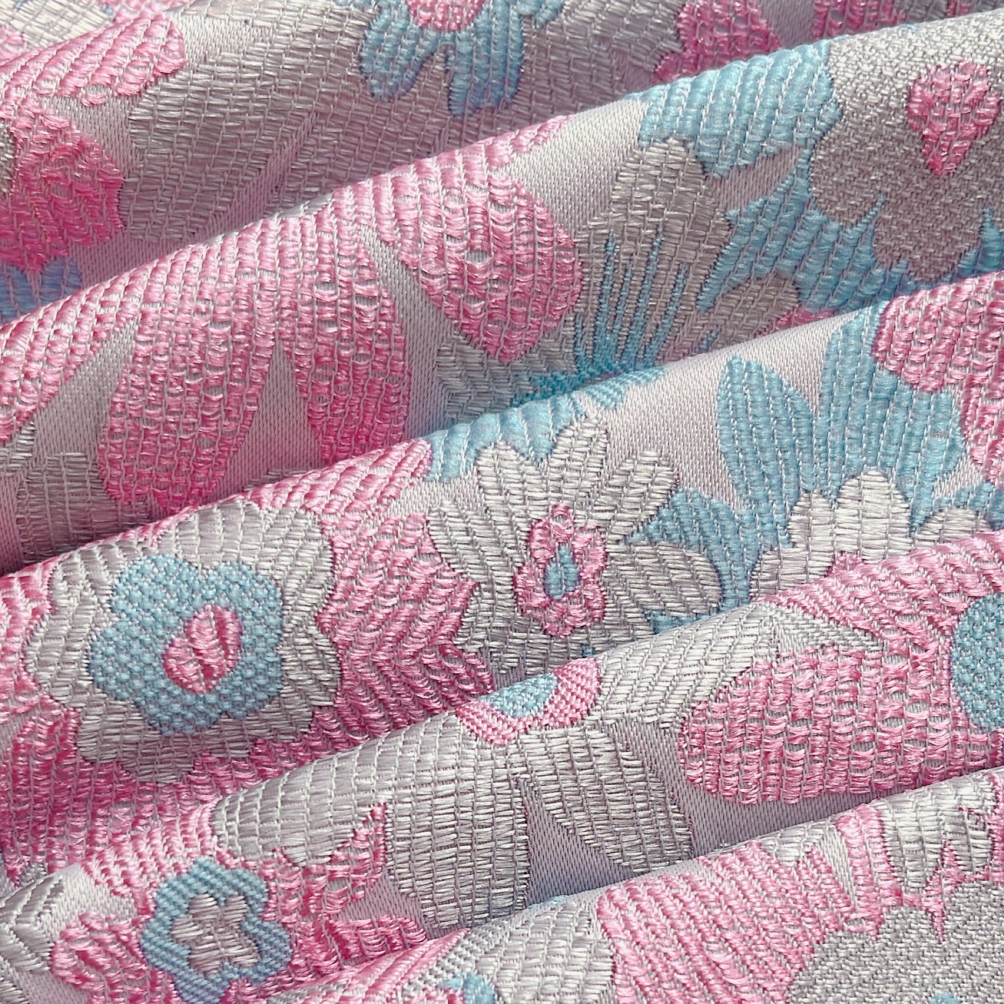 海外から買い付けたファンシージャガード生地です。生地全体に花柄が散りばめられており、光沢があって華やかな生地です。日本ではあまり見かけない独特な柄物の生地なので、1枚でスカートやカバンなど、ファッションのポイントになるアイテムを仕立てるのにもオススメです。