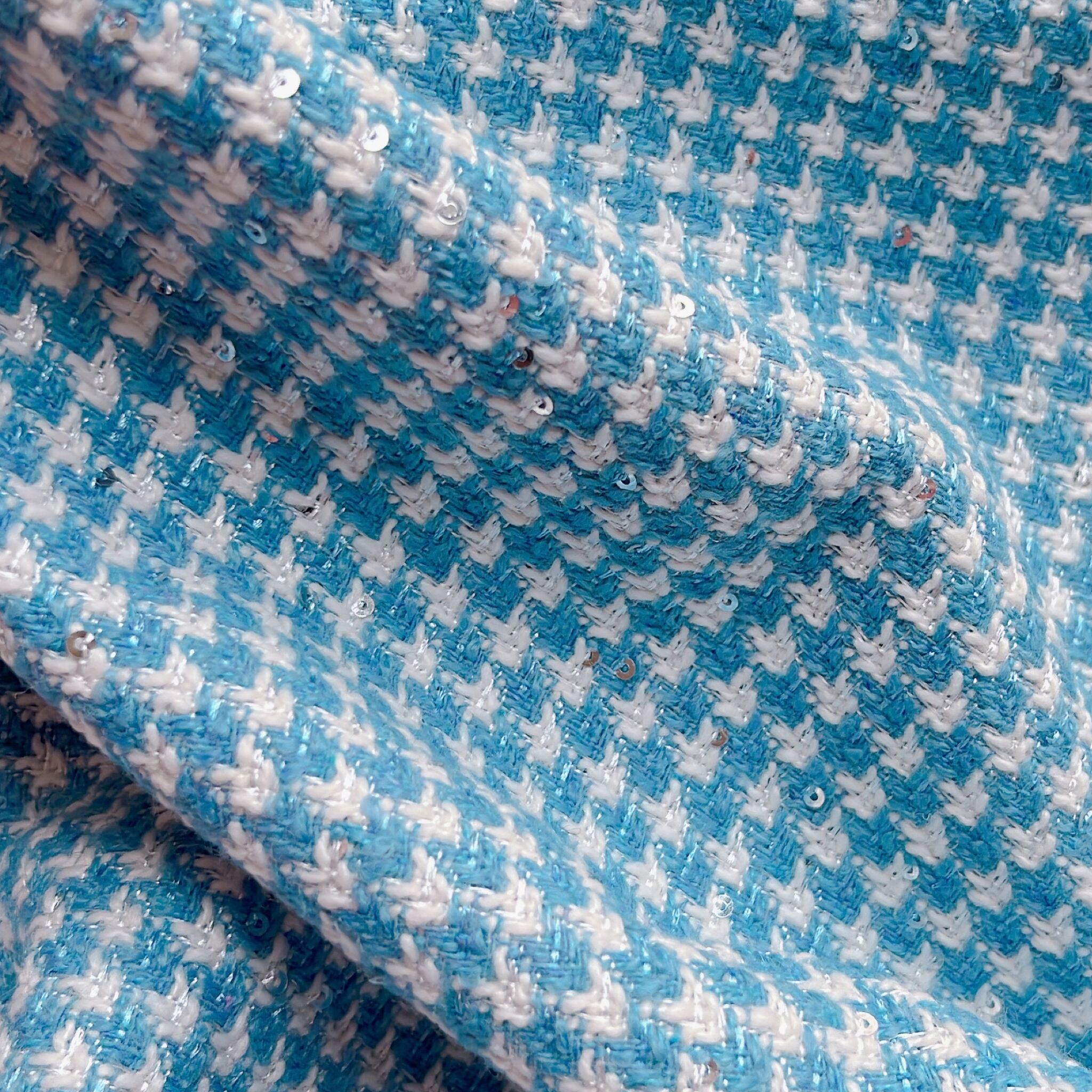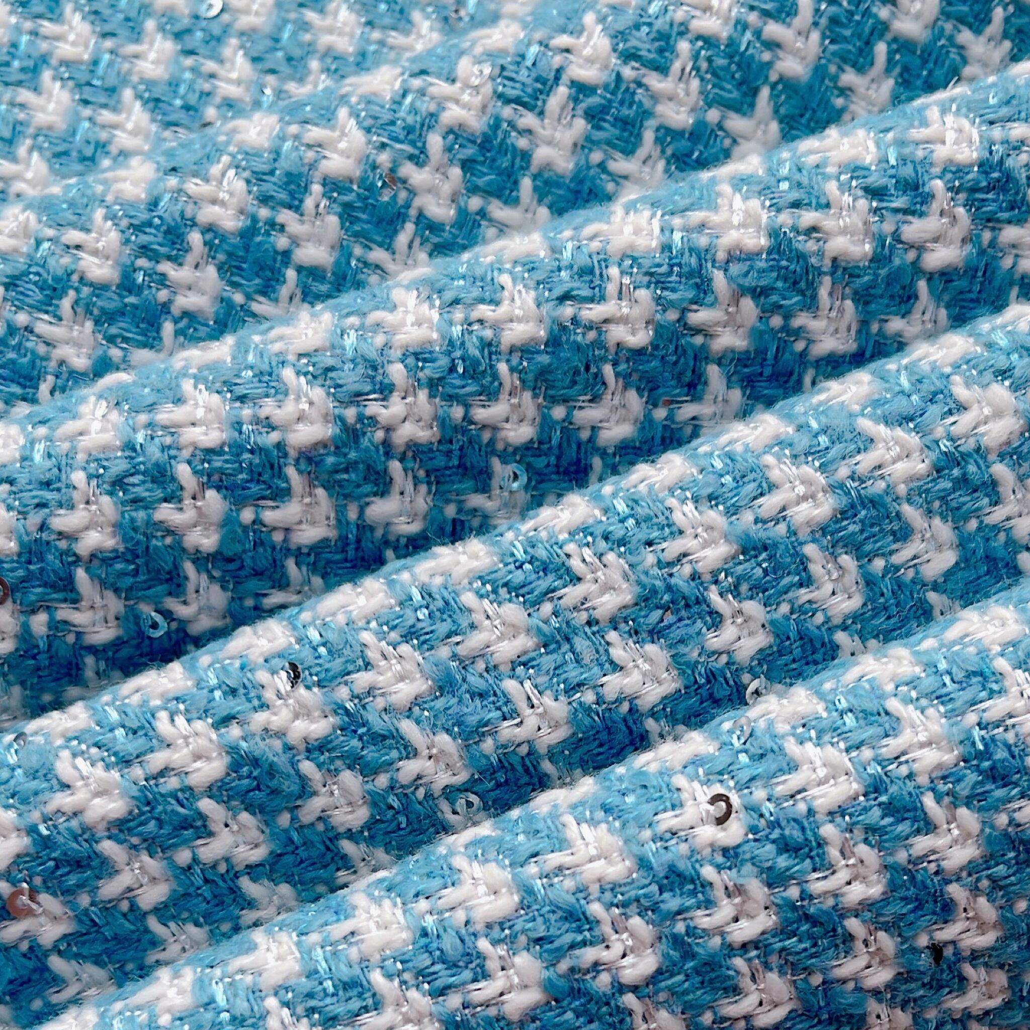 ホワイトとパステルカラーのヤーンで構成された優しいお色の生地で、小さなスパンコールが所々にあしらわれています。