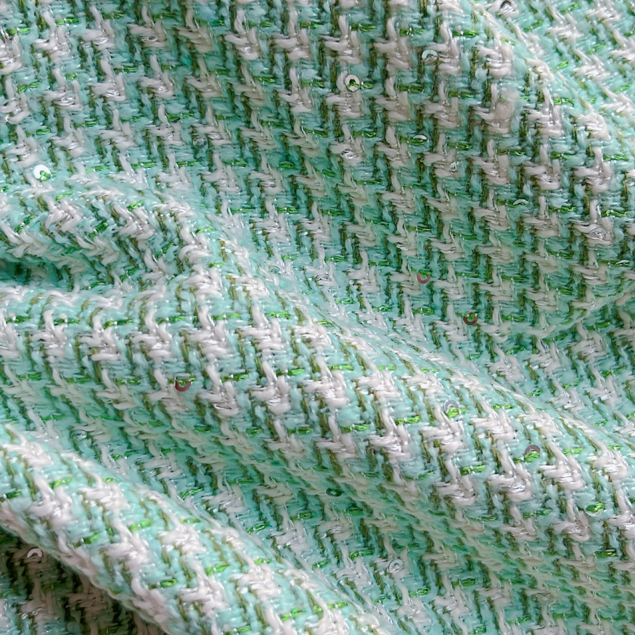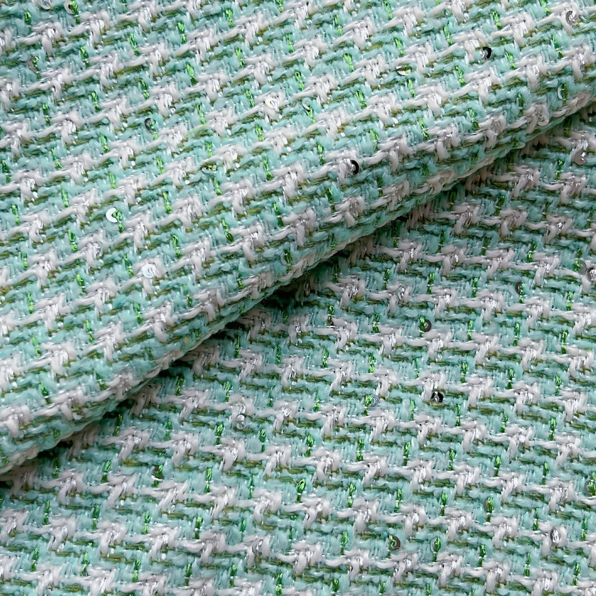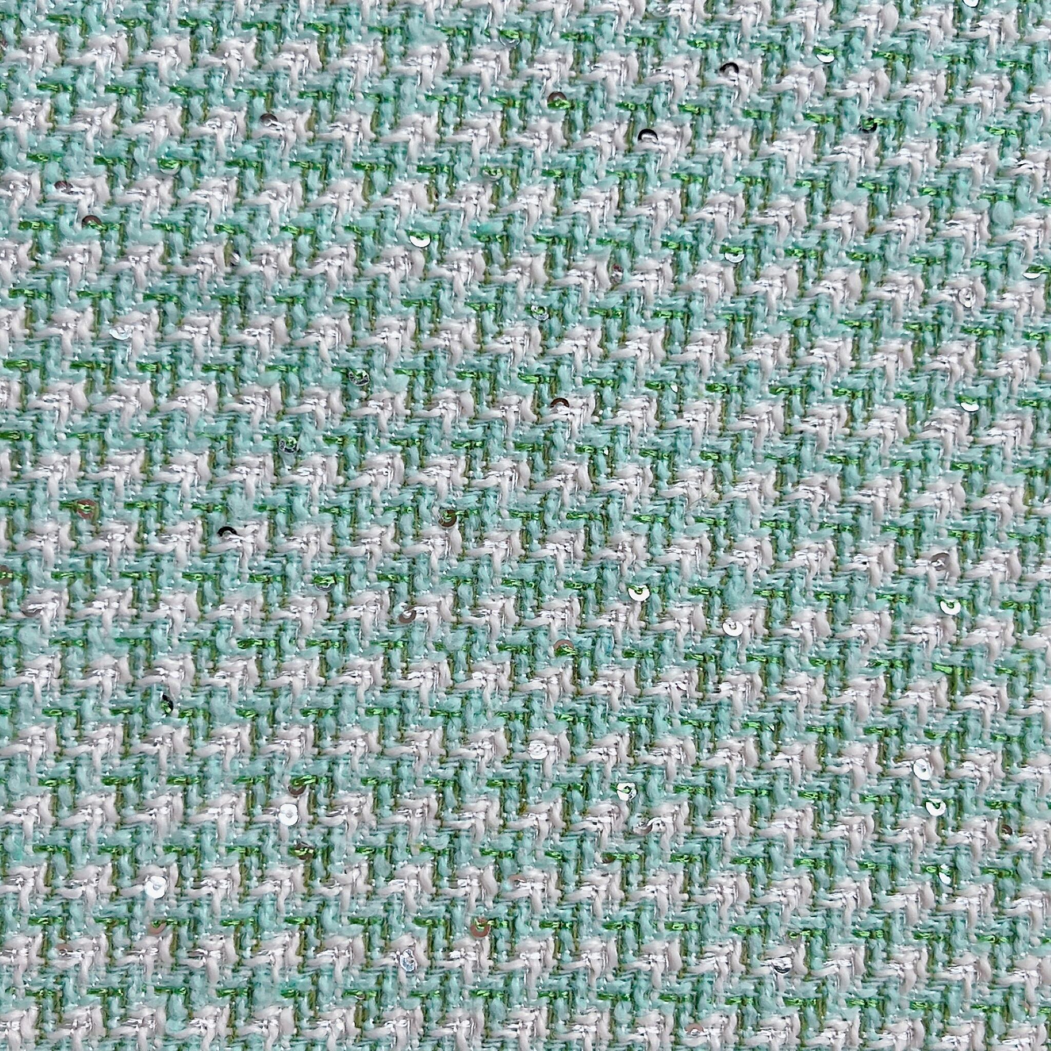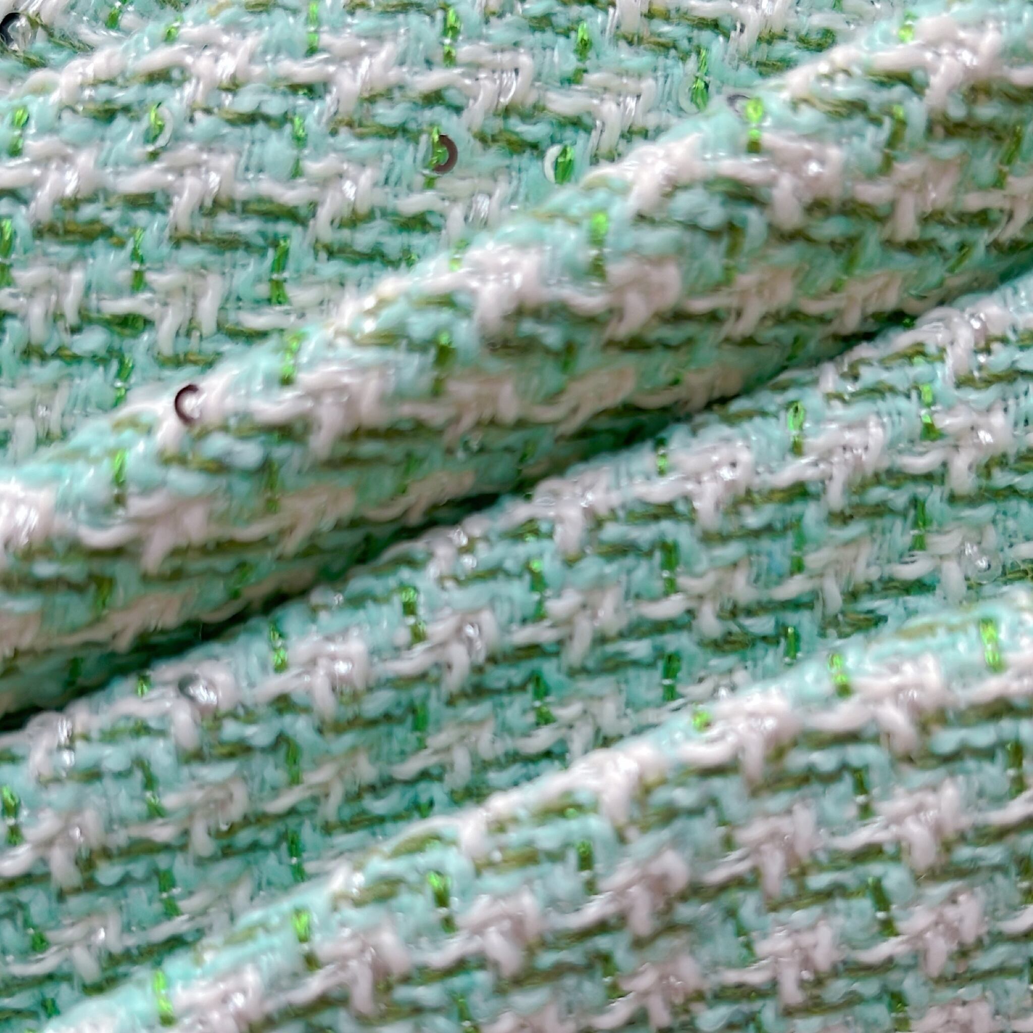 ホワイトとパステルカラーのヤーンで構成された優しいお色の生地で、小さなスパンコールが所々にあしらわれています。