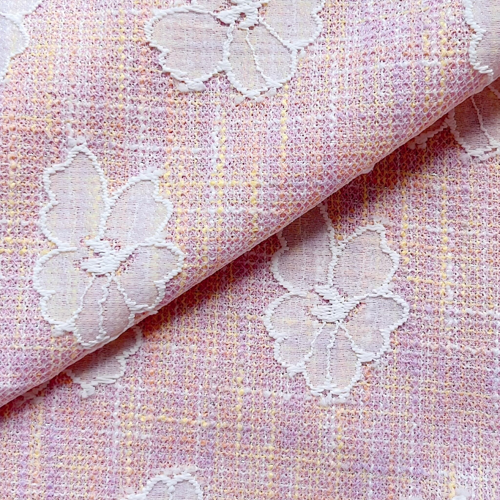 パステルカラーのヤーンで構成された優しいお色の生地で、細かく織り込まれたしっかりとしたテキストが特徴です。