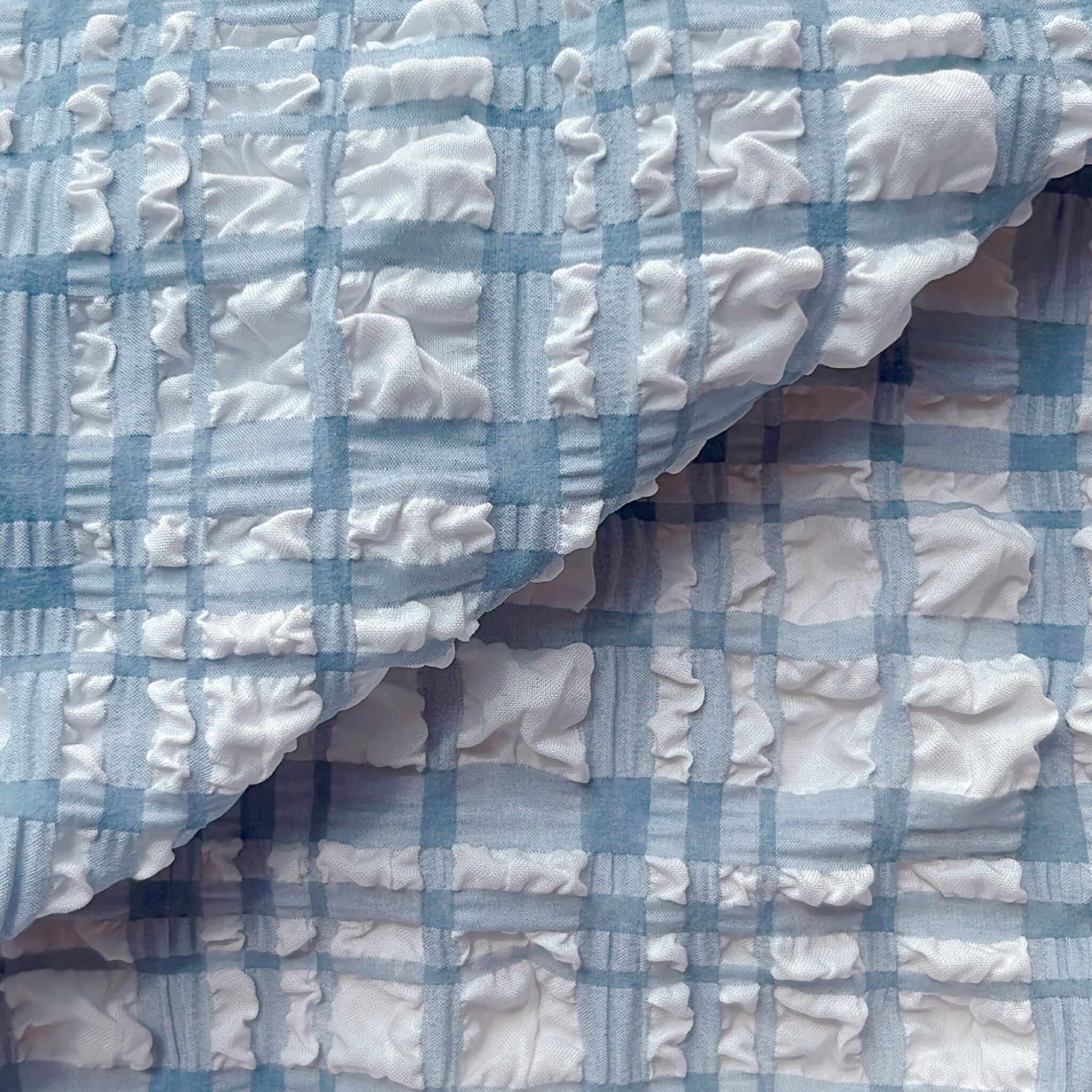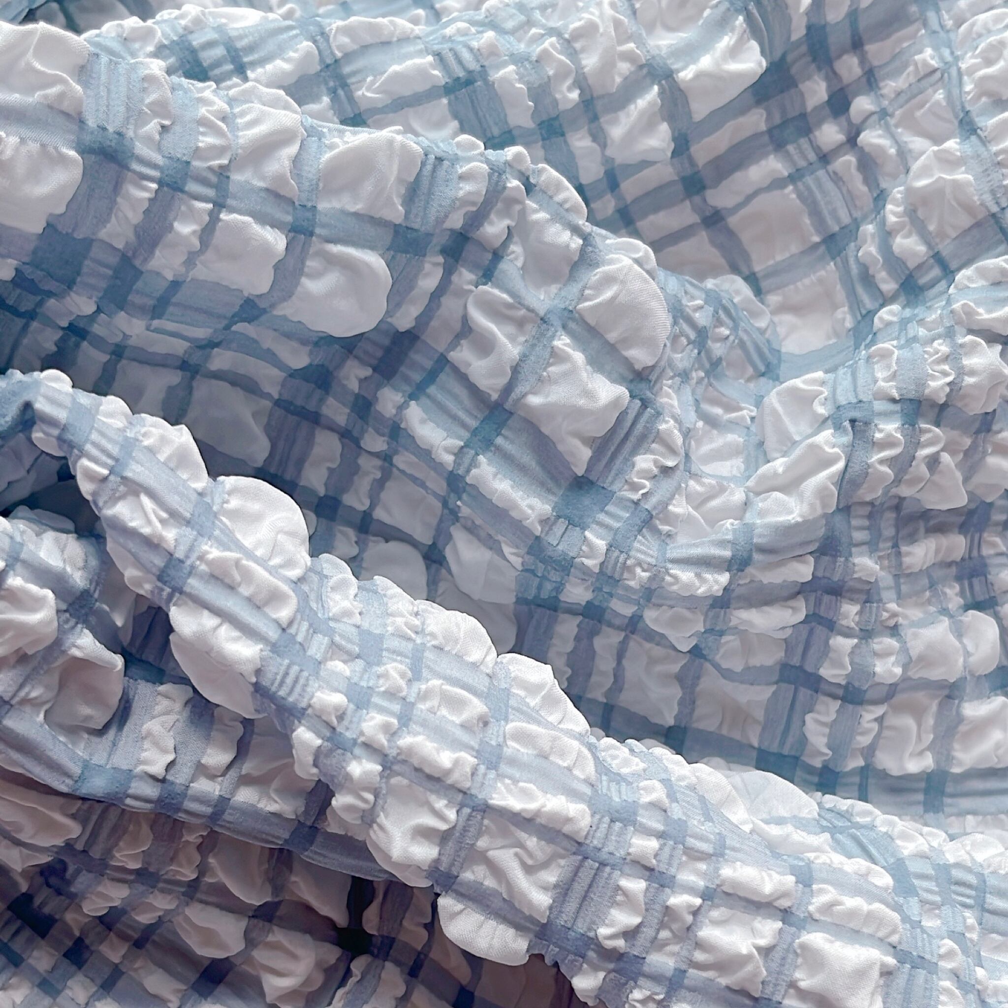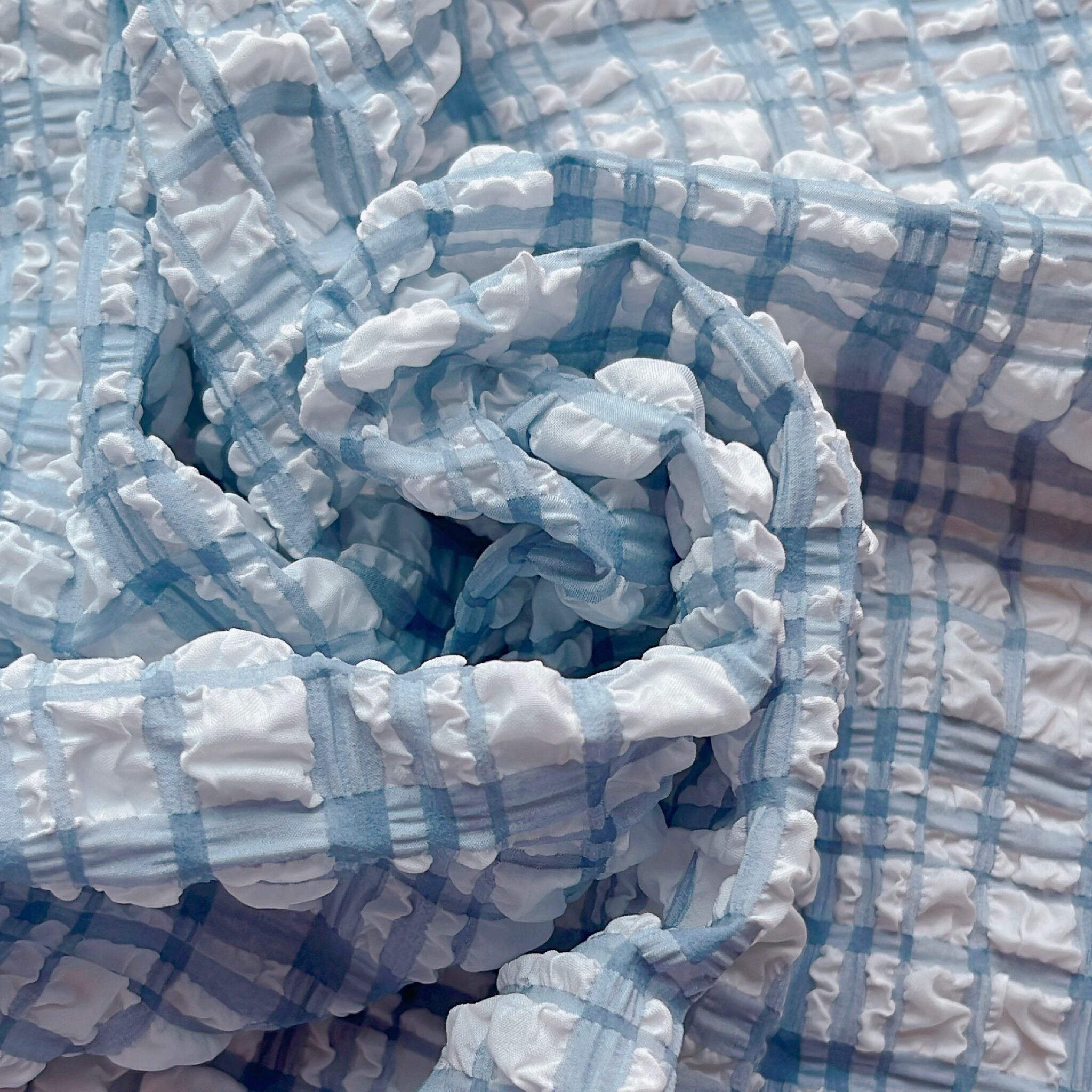 海外から買い付けたエンボス加工生地です。今年流行りの立体感のあるポコポコとした生地に、パステルカラーのチェック柄が入った可愛らしい生地です。生地自体は薄手なので、夏物のお仕立てやブラウス、袖口、裾などの装飾にぴったりな生地だと思います。