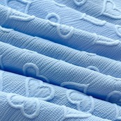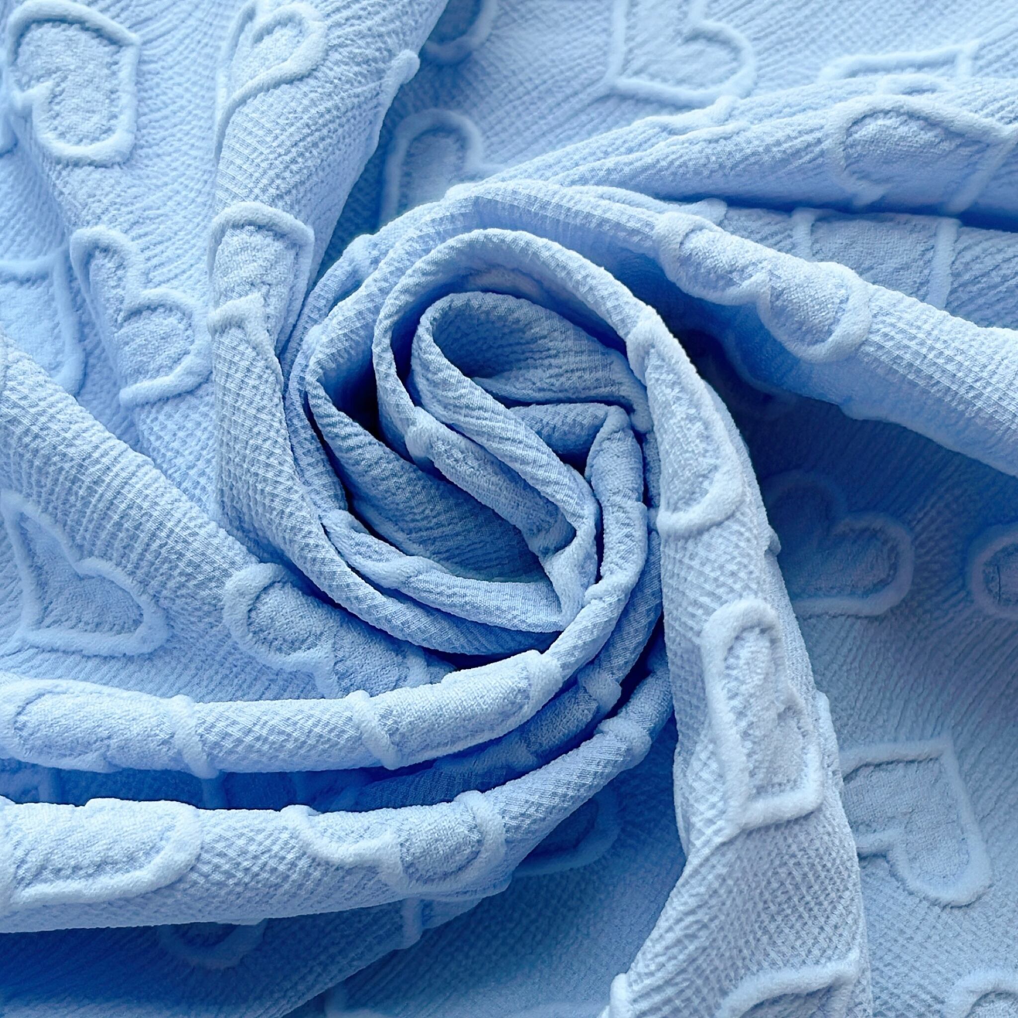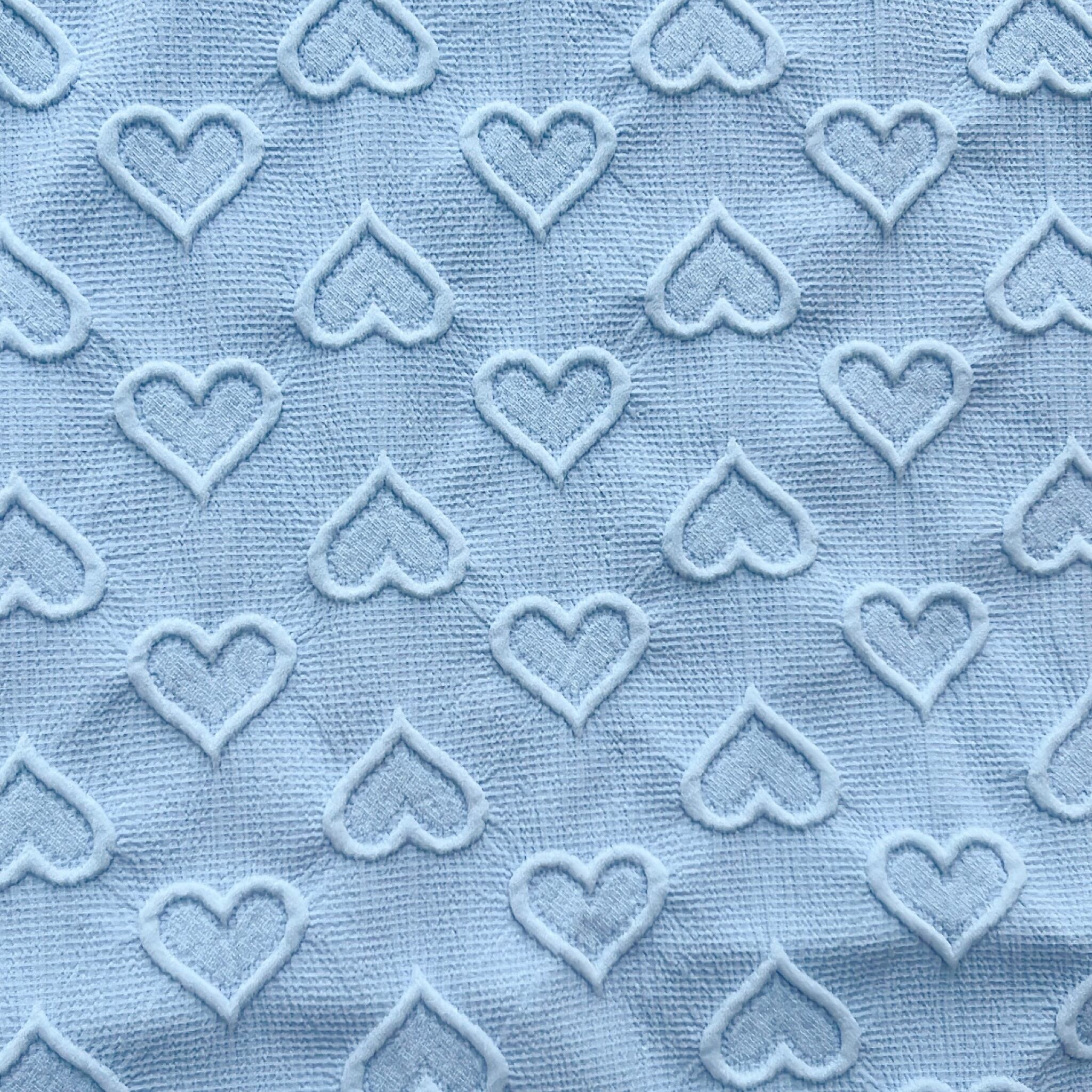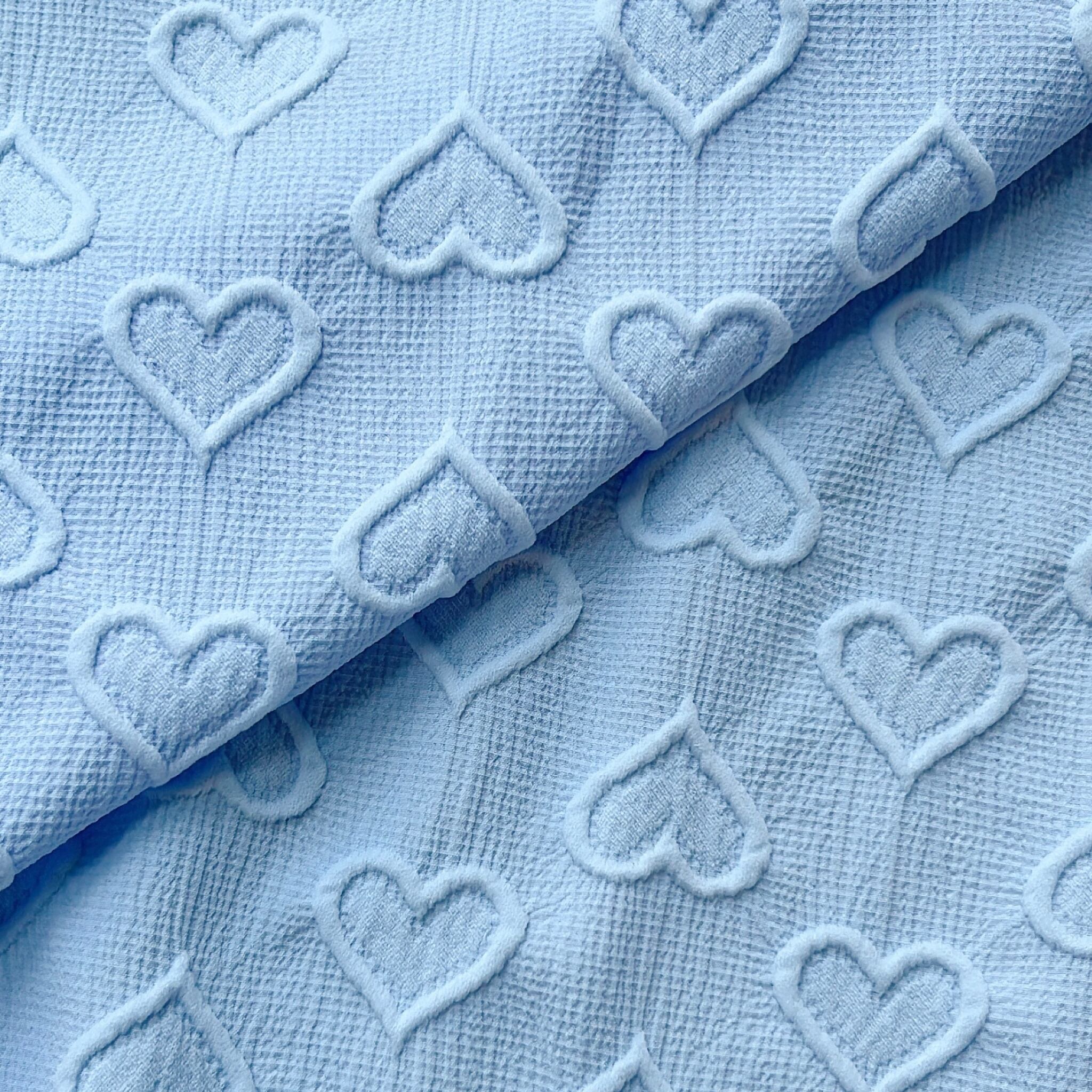 生地全体にぷっくりと浮き出たハート柄がデザインされていて、インパクトがあり可愛らしい生地です。ジャガード独特の立体感もしっかりとあり、表情があるの生地なので、淡いカラーでもしっかりとハート柄のデザインが際立ちます。