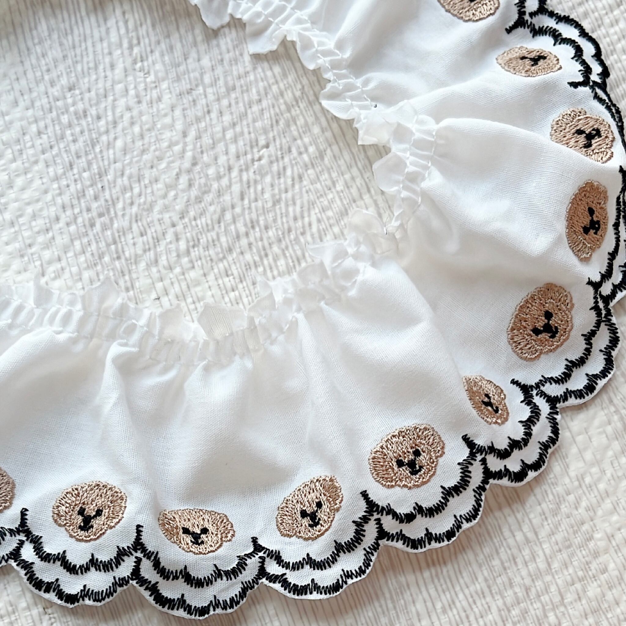 たっぷりとギャザーを寄せたフリルレースに、愛らしい刺繍を施した大きめでインパクトのあるレースです。襟元や裾の装飾にお使い頂くと、お召し物にアクセントを加え、より華やかな作品に仕上がります。また、刺繍で施されたそれぞれのモチーフが可愛らしさを一段とアップさせます。