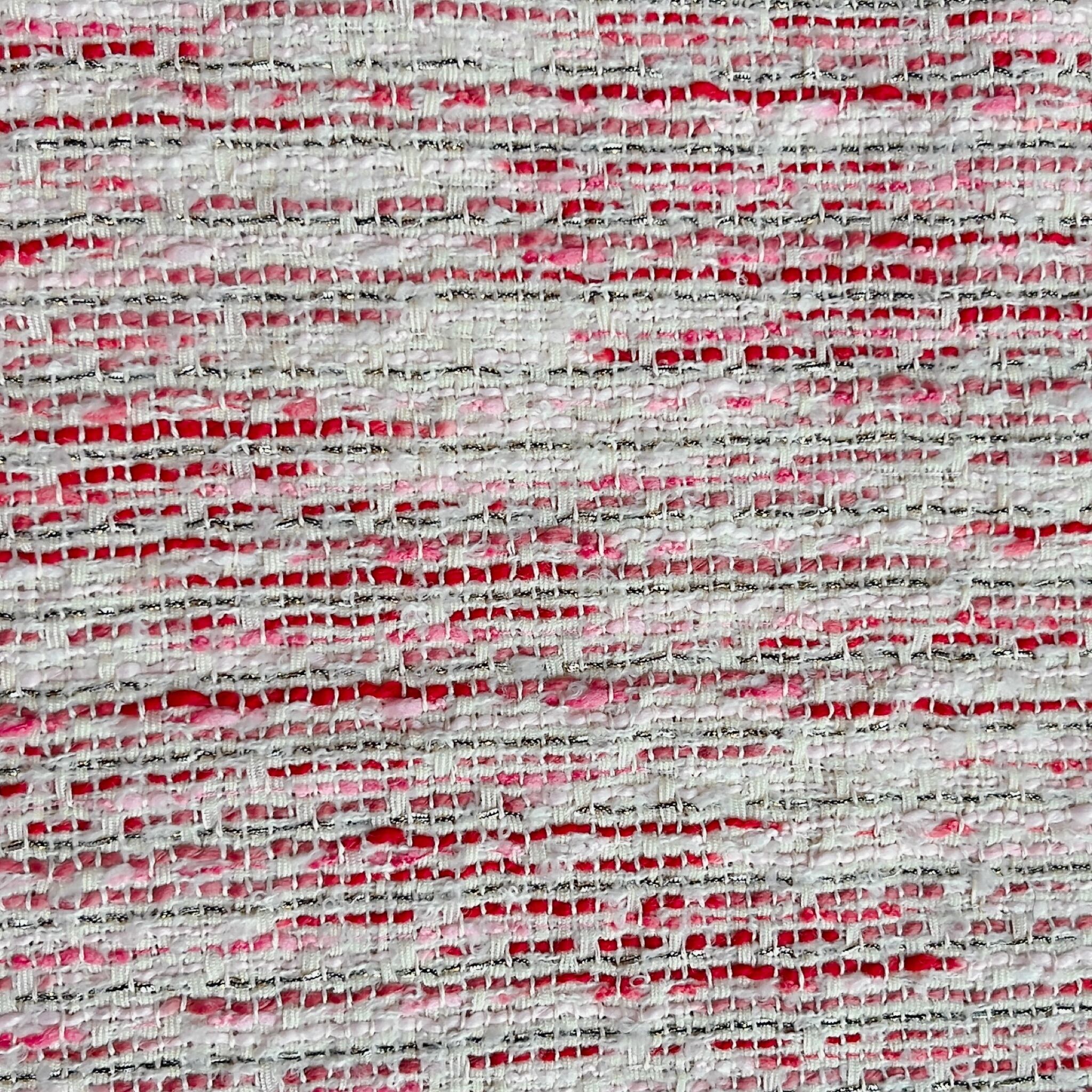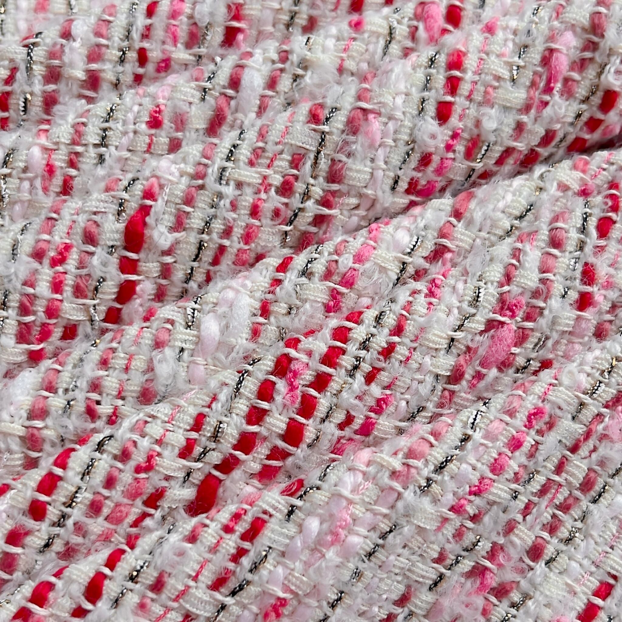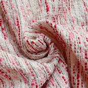 海外から買い付けたファンシーツイードの生地です。メインのカラーを基調に太さや質感の異なるヤーンを複数織り込んだ、ポップで遊び心のあるファブリックです。