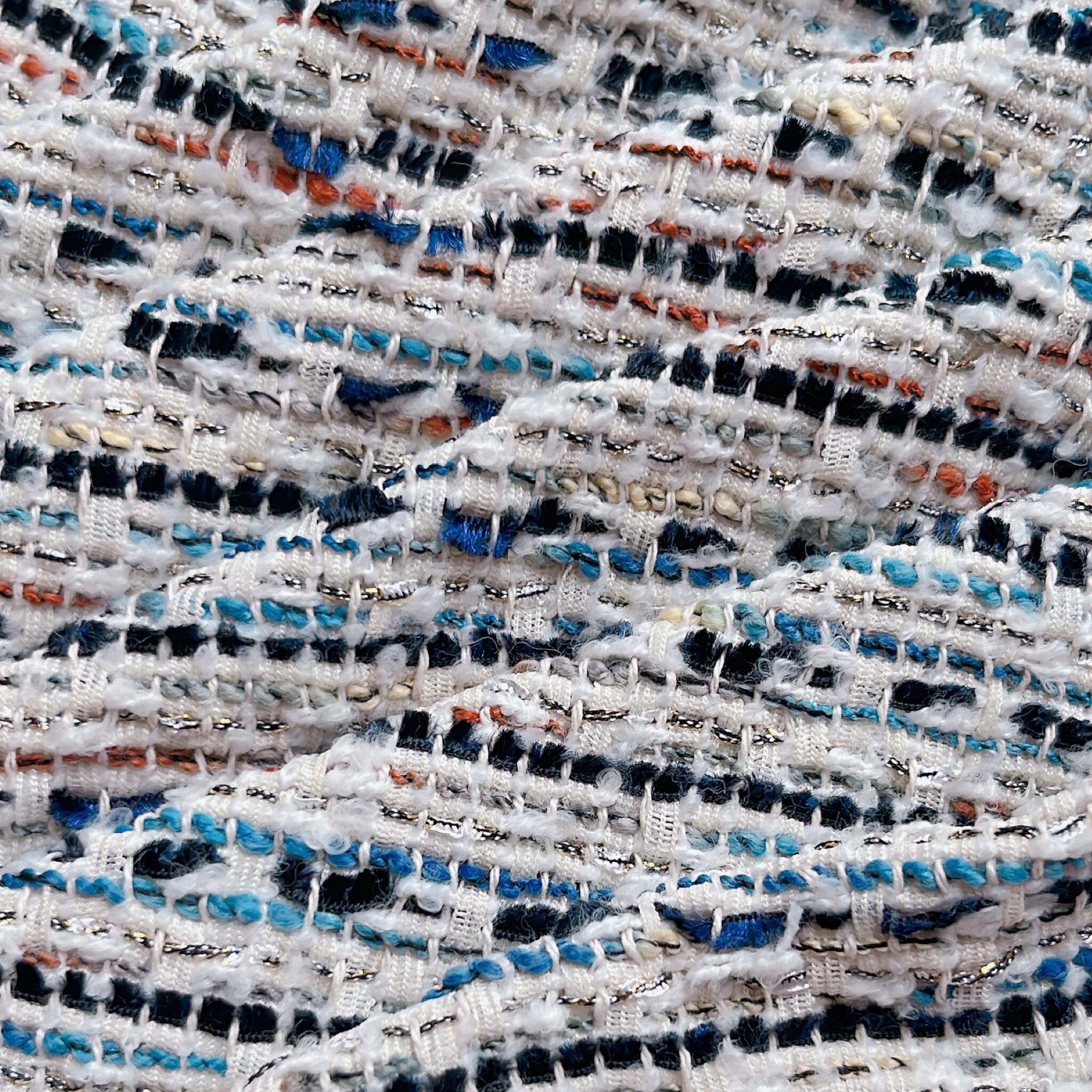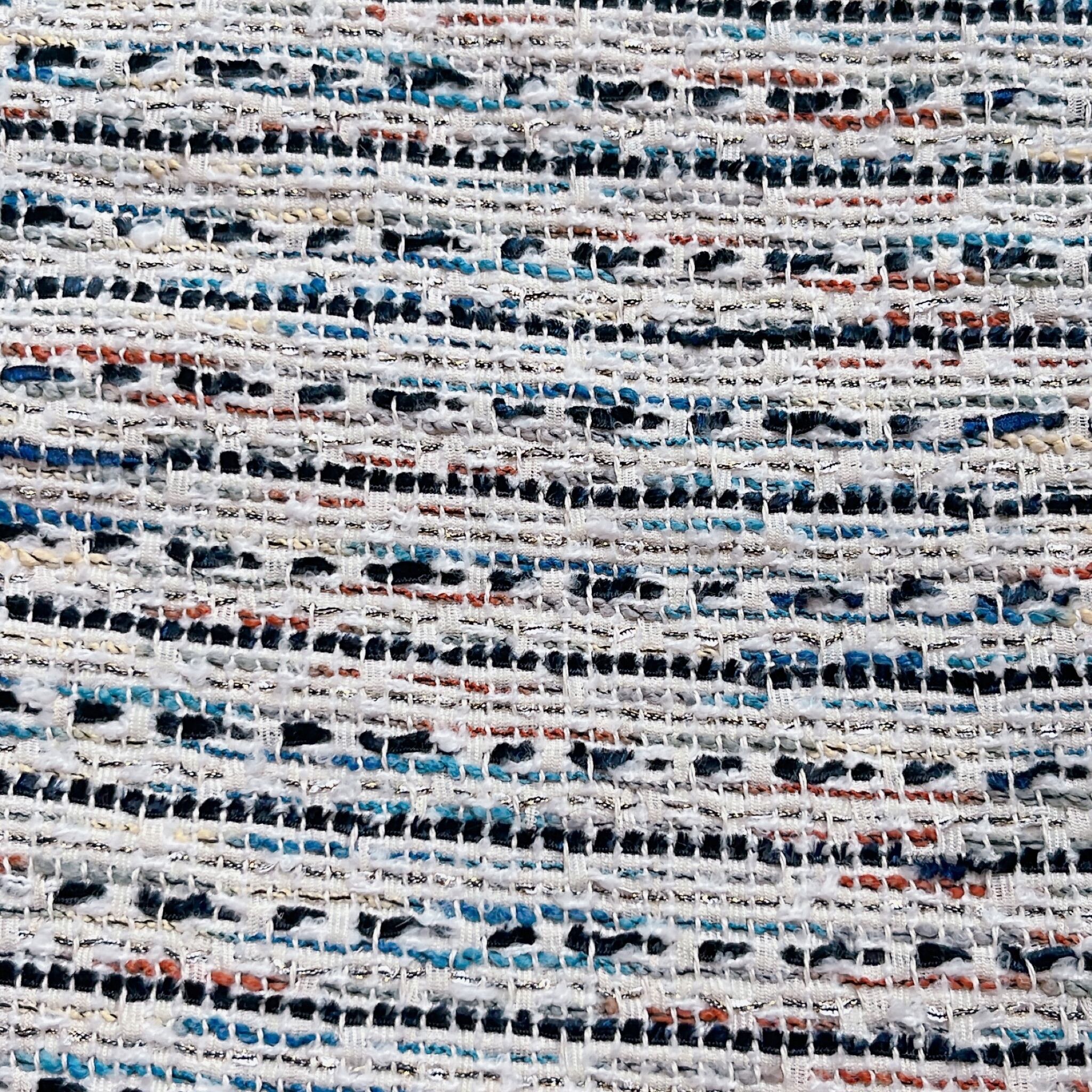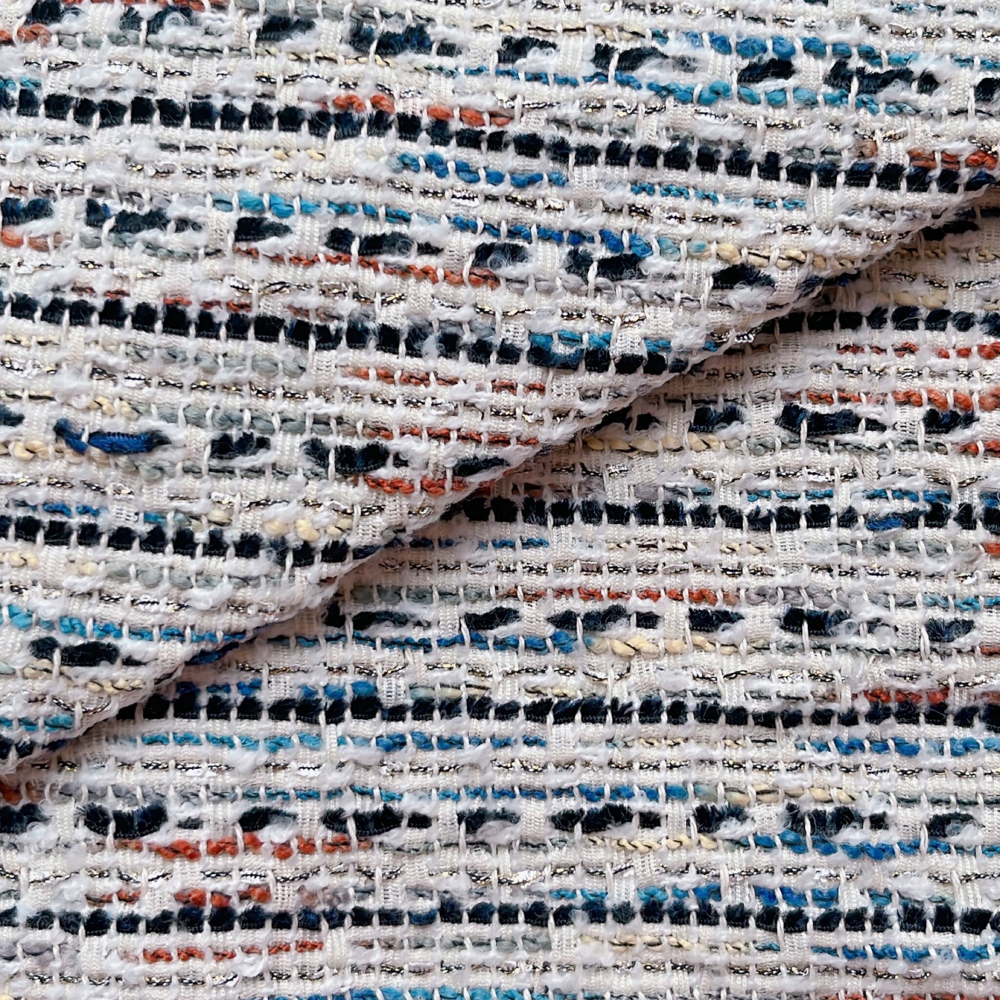 海外から買い付けたファンシーツイードの生地です。メインのカラーを基調に太さや質感の異なるヤーンを複数織り込んだ、ポップで遊び心のあるファブリックです。