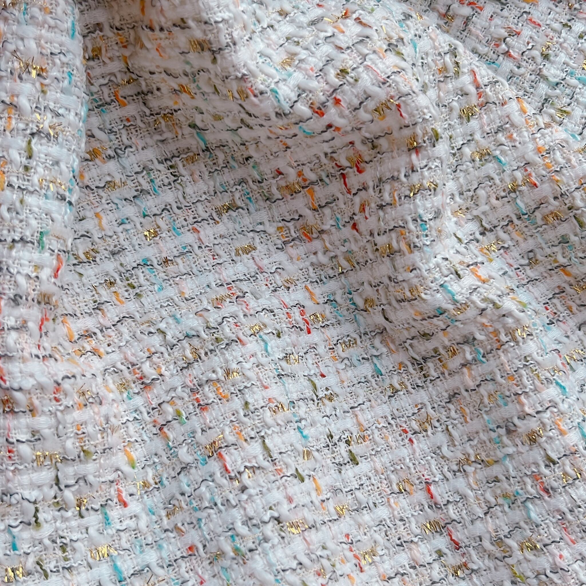 海外から買い付けたファンシーツイードの生地です。パステルカラーのヤーンを基調に、細かくカラフルな色味の糸が織り込まれていて、可愛らしくポップな生地です。金のラメ糸が織り込まれていてアクセントとなっている為、華やかさもあります。比較的目の細かい生地なので、これからのシーズンのお仕立にもオススメです。