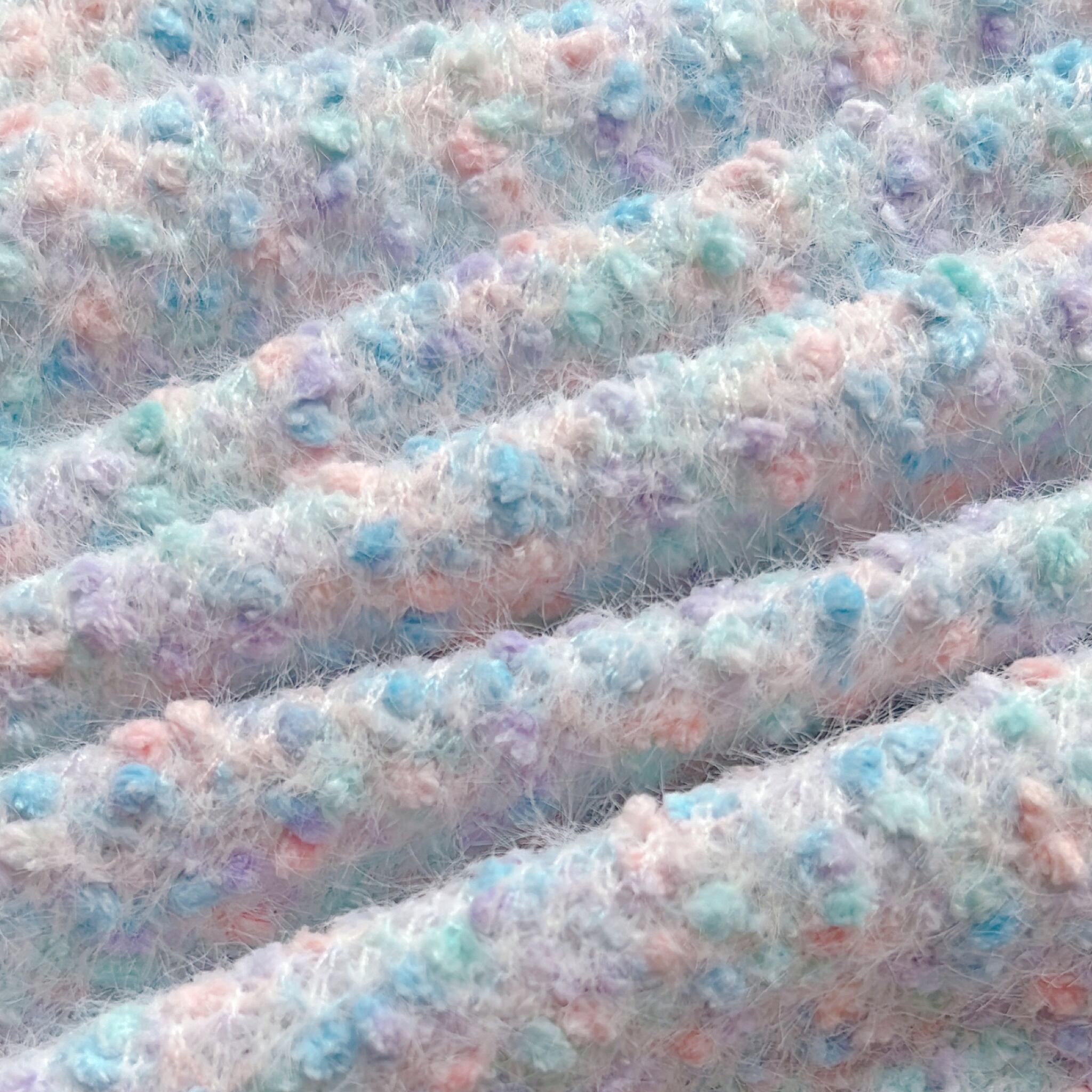 海外から買い付けたボア加工の生地です。ボア加工独特のフワフワとした柔らかい手触りと、ぽこぽこと浮き出たカラフルな毛玉が可愛らしいファブリックです。ボア加工ならではの肌触りの良さと、細かに構成された鮮やかなグラデーションをお楽しみください。横面は多少の伸縮性が有る生地となっている為、お子様の洋服やベビー用品小物など幅広いアイテムにご使用頂けます。また、滑らかな肌触りと多少の保温性のある材質の為、羽織やケープ、カーディガンなどにもご使用頂けます。