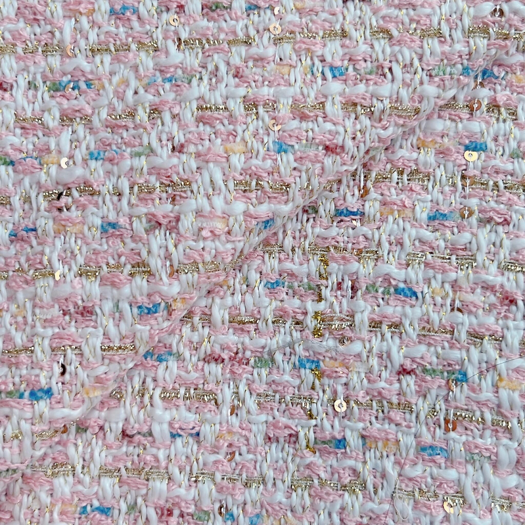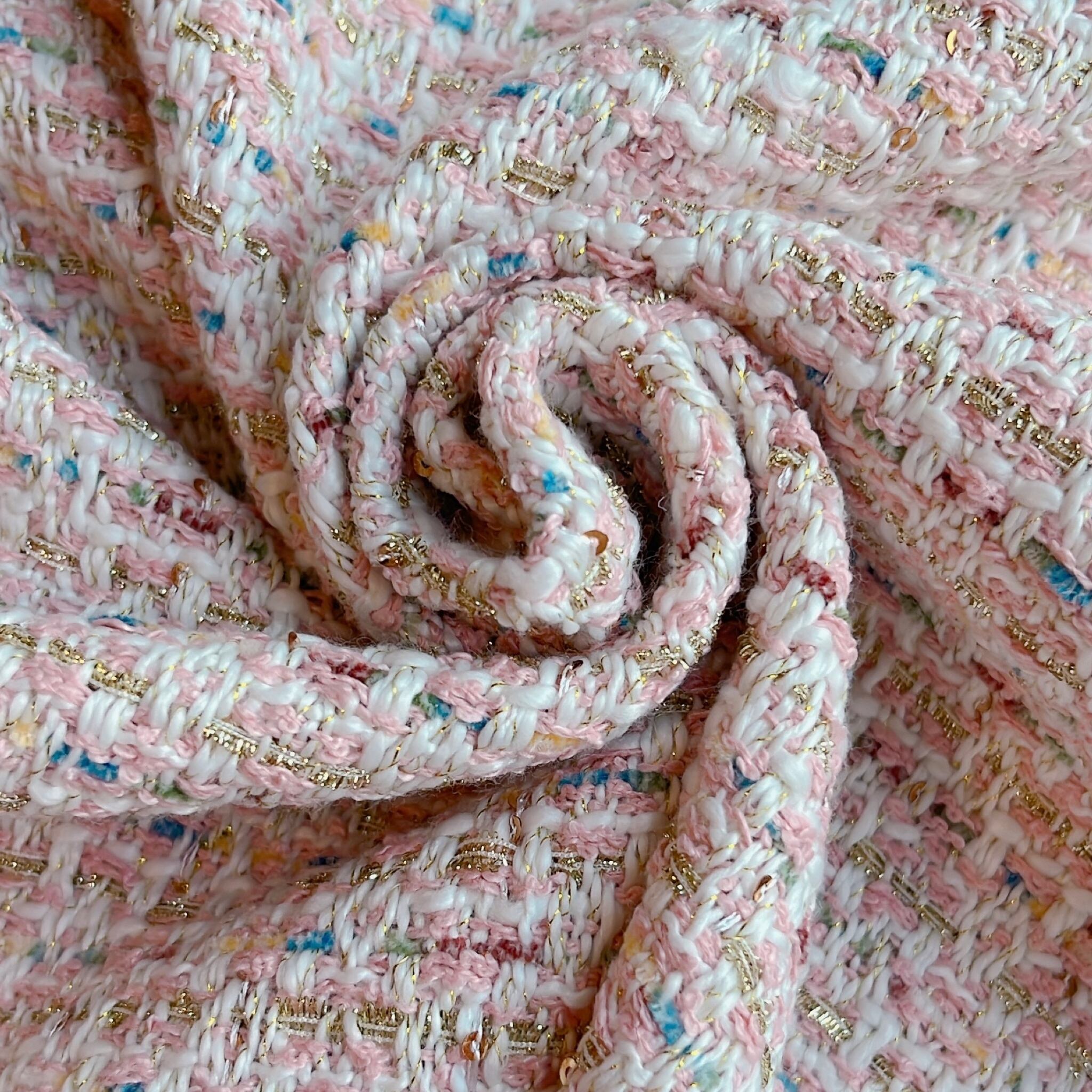 海外から買い付けたファンシーツイードの生地です。ピンク色を中心に、細かくカラフルな色味のヤーンが織り込まれています。また、太めのゴールドヤーンも織り込まれていて、華やかさが加わった、冬らしく暖かみのあるツイードです。ツイード生地の中でも手触りが良く、滑らかな手触りの生地となっていますので、お洋服やお召し物のお仕立てにもオススメです。