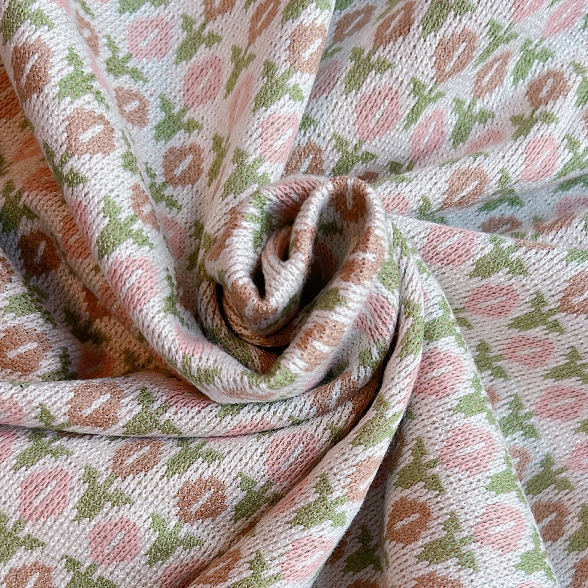 海外から買い付けたお花柄パターンのニット生生地です。柄はプリントではなくニット柄で構成されている為、多少のヨレやシワが入っても、綺麗に見えます。また、ニット素材独特のの伸縮性が多少ある為、お召し物等のお仕立てにも着脱のしやすさが生きます。冬に使用するアイテム、小物やカバー類などの制作にいかがでしょうか。