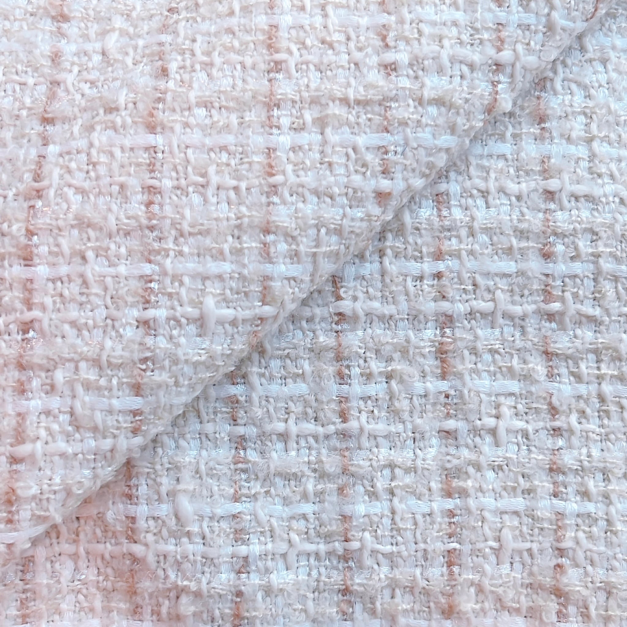 海外から買い付けたファンシーツイードの生地です。暖かな色味に、太めのヤーンで織り込まれたツイード柄が華やかで可愛らしいツイード生地です。冬らしく暖かみのあるツイード生地で、厚みがあり、冬物のお仕立てに向いています。ツイード生地の中でも手触りが良く、滑らかな手触りの生地となっていますので、お洋服やお召し物のお仕立てにもオススメです。