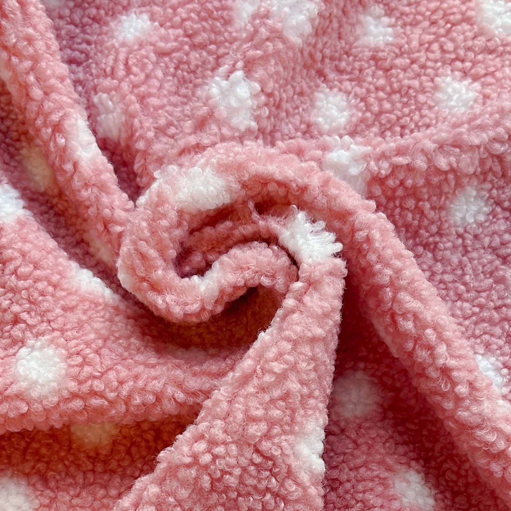 海外から買い付けたボア加工の生地です。ボア加工独特のフワフワとした柔らかい手触りと、ドット柄のプリントが可愛らしいファブリックです。ボア加工ならではの肌触りの良さを活かし、冬らしい暖かみのあるグッズのお仕立てなどにいかがでしょうか。