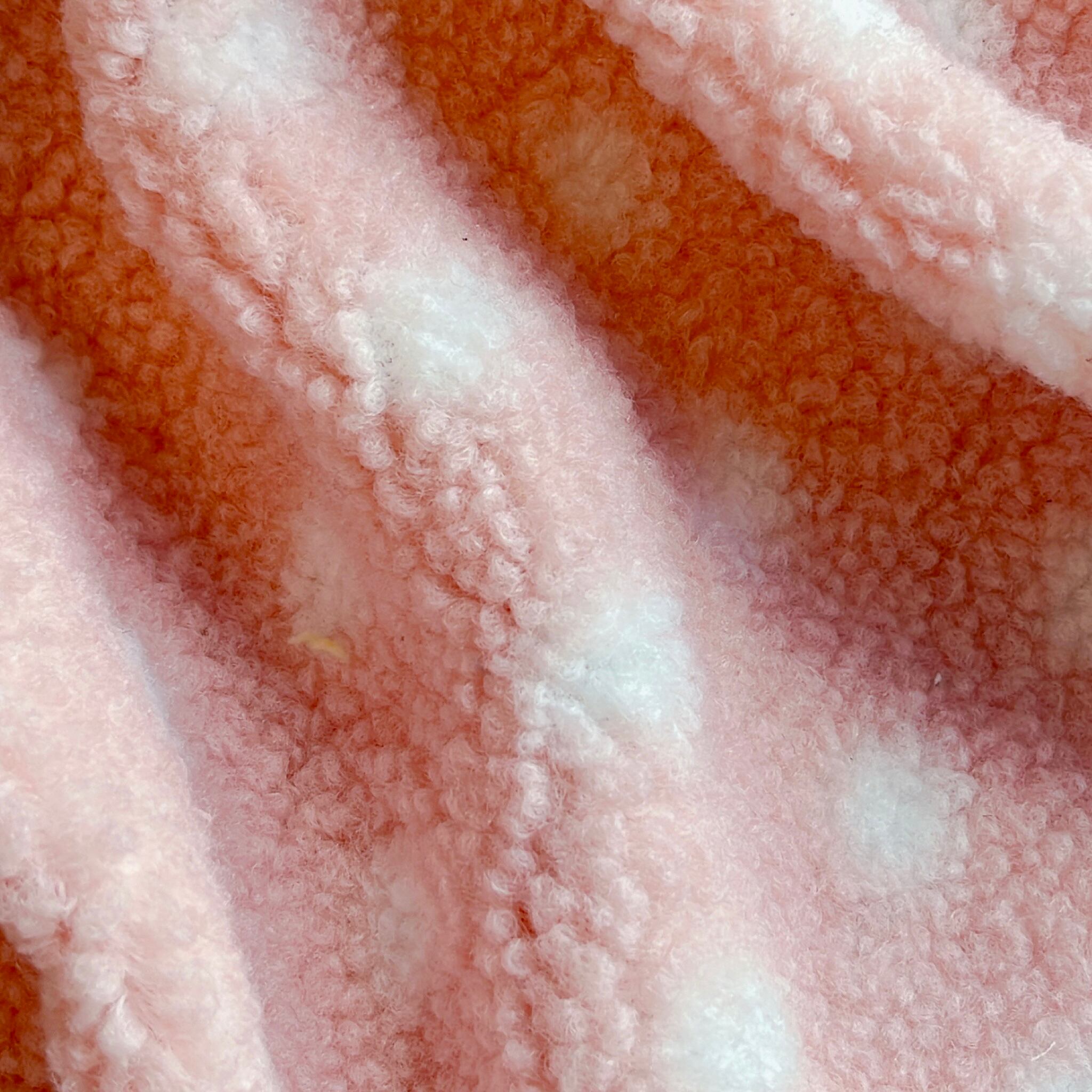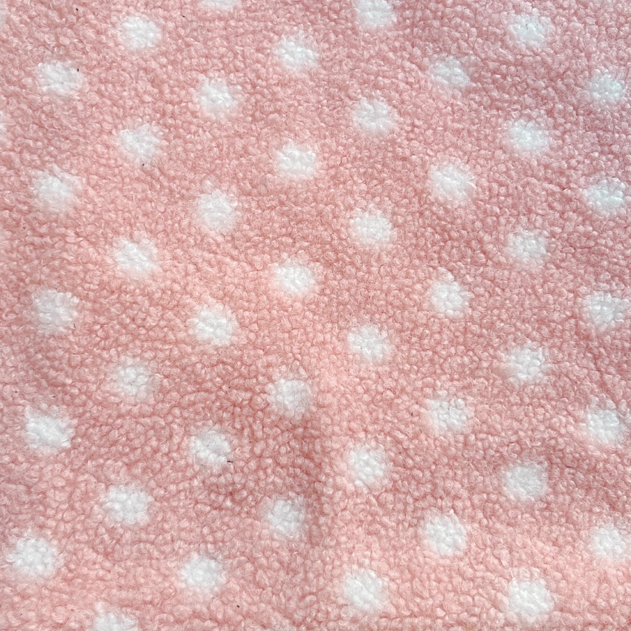 海外から買い付けたボア加工の生地です。ボア加工独特のフワフワとした柔らかい手触りと、ドット柄のプリントが可愛らしいファブリックです。ボア加工ならではの肌触りの良さを活かし、冬らしい暖かみのあるグッズのお仕立てなどにいかがでしょうか。