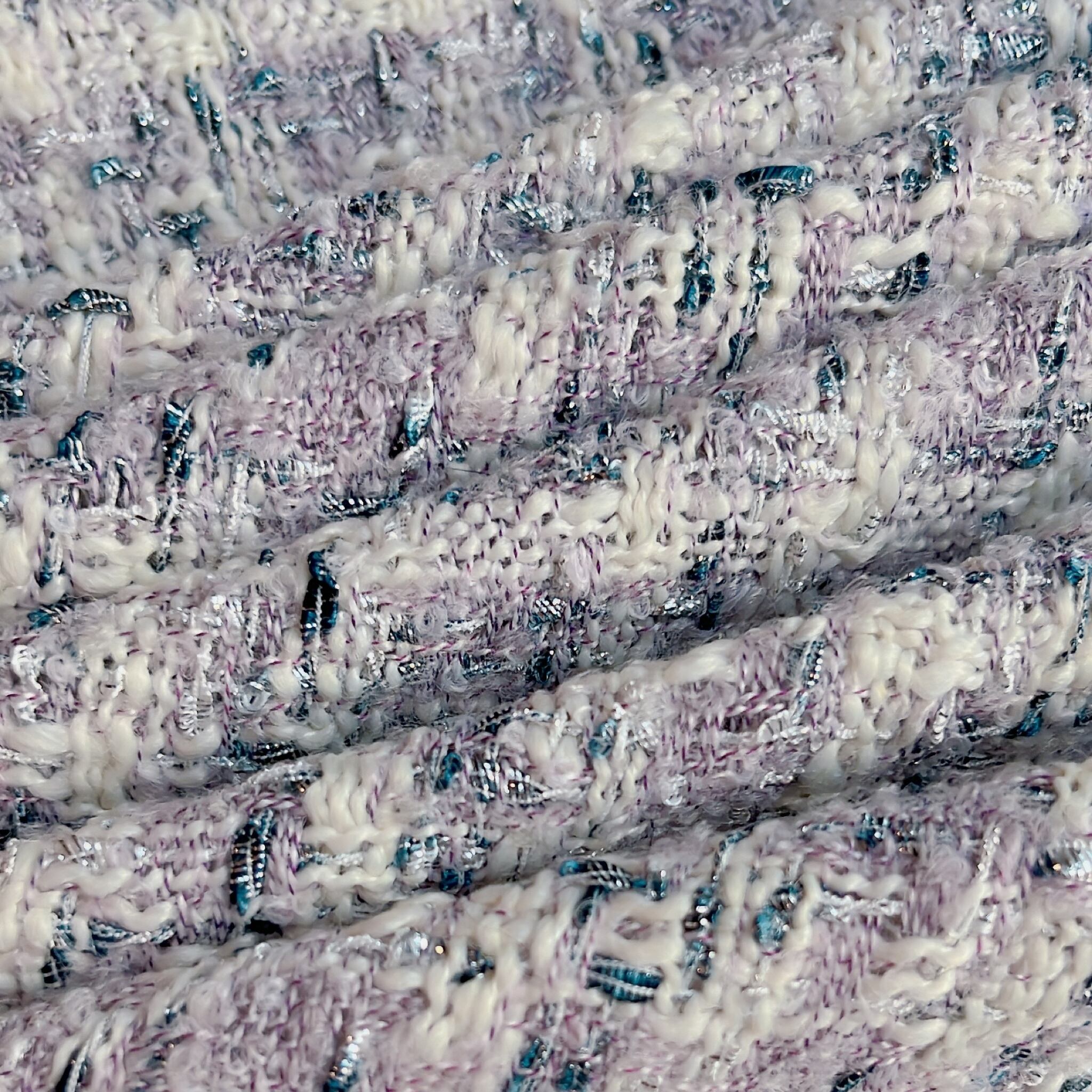 海外から買い付けたファンシーツイードの生地です。落ち着いたお色味の生地で、お洋服のお仕立てにもピッタリな生地だと思います。また、ブルーとシルバーのラメ糸が入っていてアクセントになっている為、ファンシーツイード生地ならではの華やかさもあります。冬らしく寒色のツイード生地ですが、他の装飾品やレース、ボタン等との相性も良さそうです。お小物やインテリア用品のお仕立てにもオススメです。