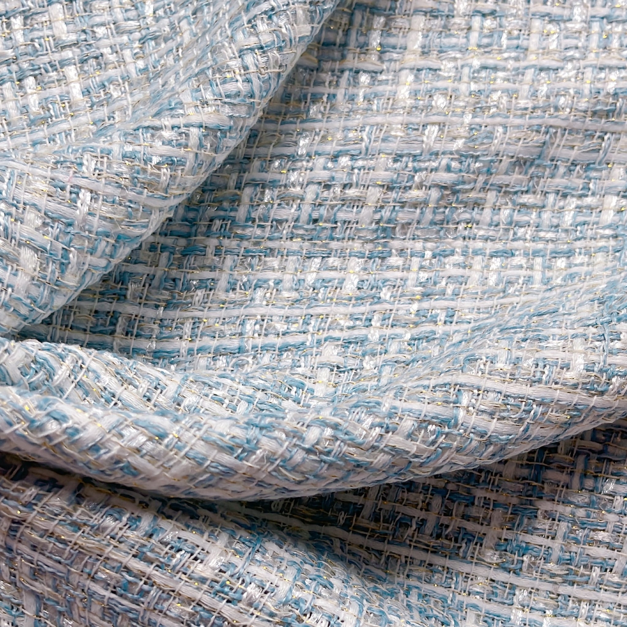 海外から買い付けたファンシーツイードの生地です。パステルカラーの優しいお色が特徴の生地で、夏らしい太めのホワイトヤーンが織り込まれた爽やかなファブリックです。また、細い金糸が織り込まれている為、キラキラと輝き、見る角度や光の当たり具合によってキラキラと輝きます。生地自体に透け感は無くしっかりとした生地ですが、通気性のある生地で、夏のお仕立てにもピッタリの生地です。バッグやジャケットなどのお仕立てにもオススメです。明るく夏らしいヤーンで織り込まれた爽やかなツイードテキストをお楽しみください。