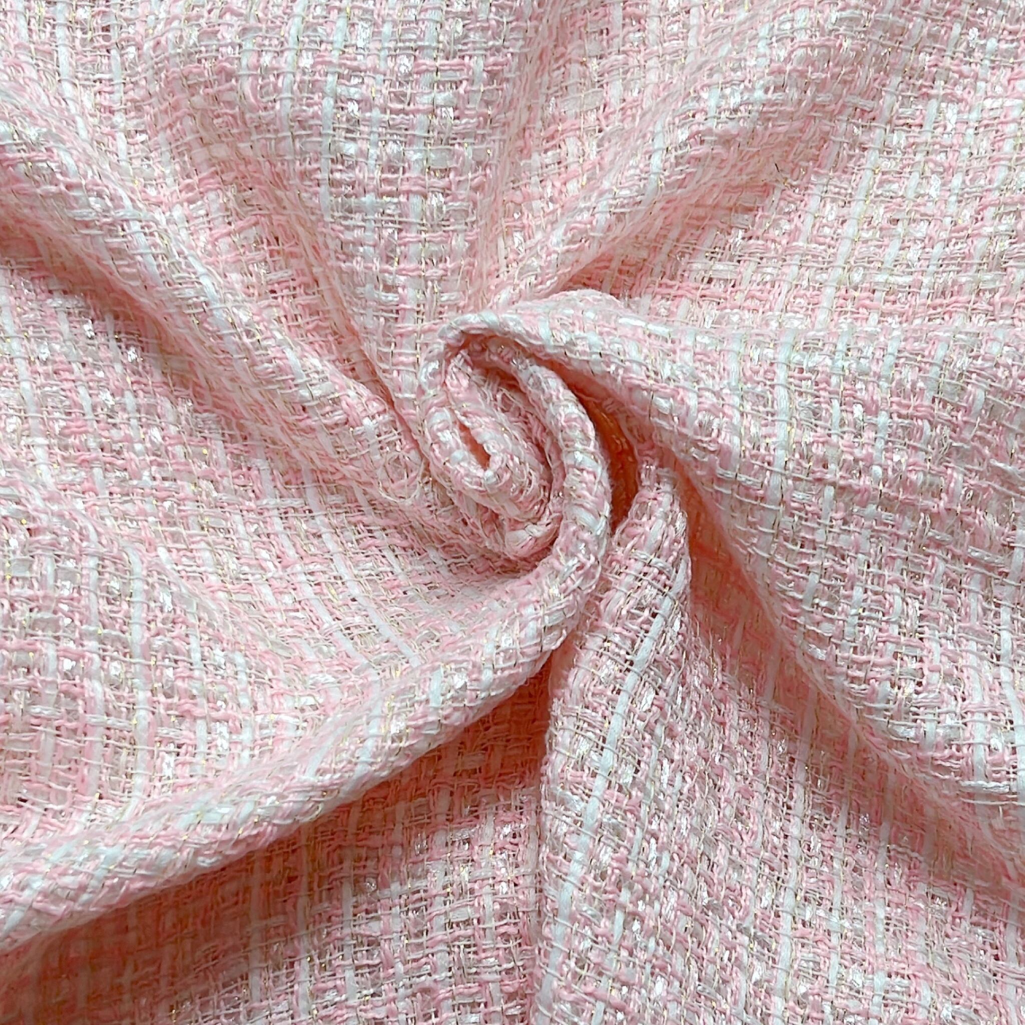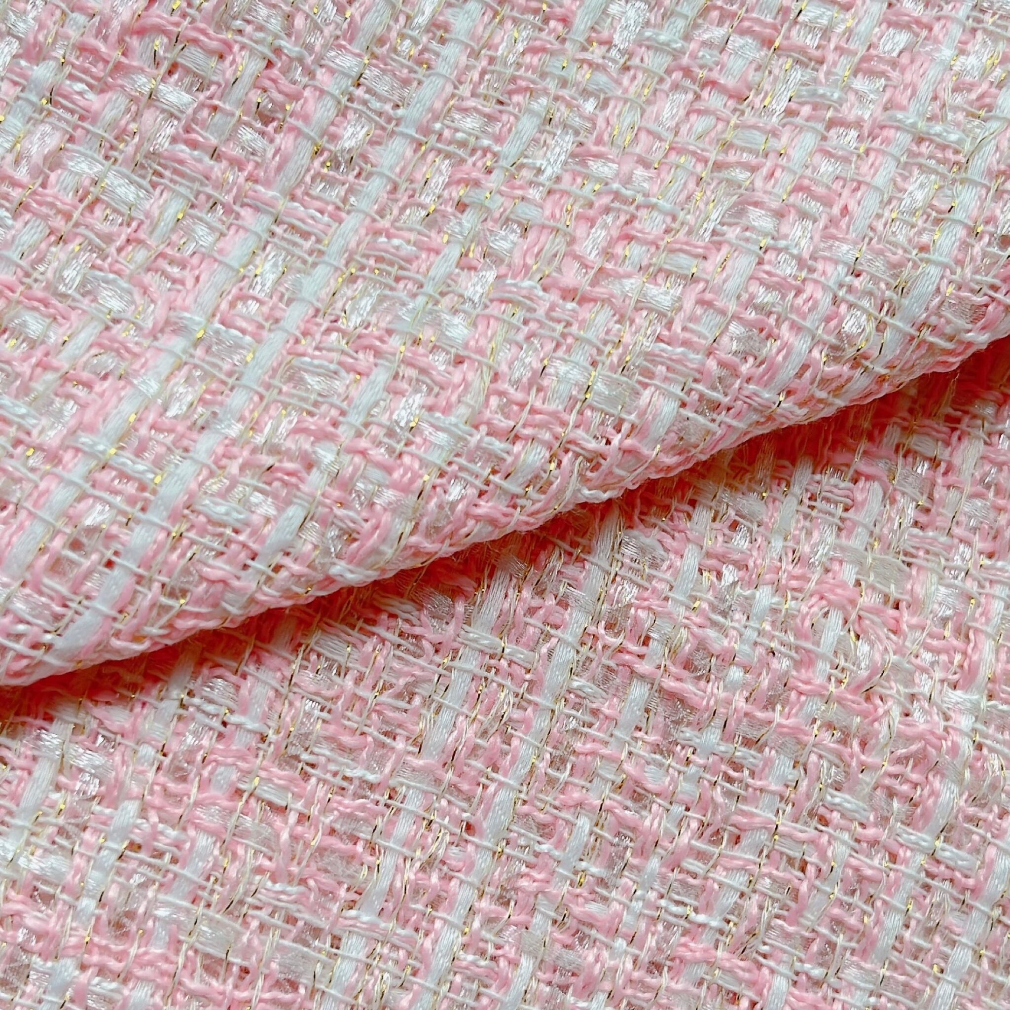 海外から買い付けたファンシーツイードの生地です。パステルカラーの優しいお色が特徴の生地で、夏らしい太めのホワイトヤーンが織り込まれた爽やかなファブリックです。また、細い金糸が織り込まれている為、キラキラと輝き、見る角度や光の当たり具合によってキラキラと輝きます。生地自体に透け感は無くしっかりとした生地ですが、通気性のある生地で、夏のお仕立てにもピッタリの生地です。バッグやジャケットなどのお仕立てにもオススメです。明るく夏らしいヤーンで織り込まれた爽やかなツイードテキストをお楽しみください。